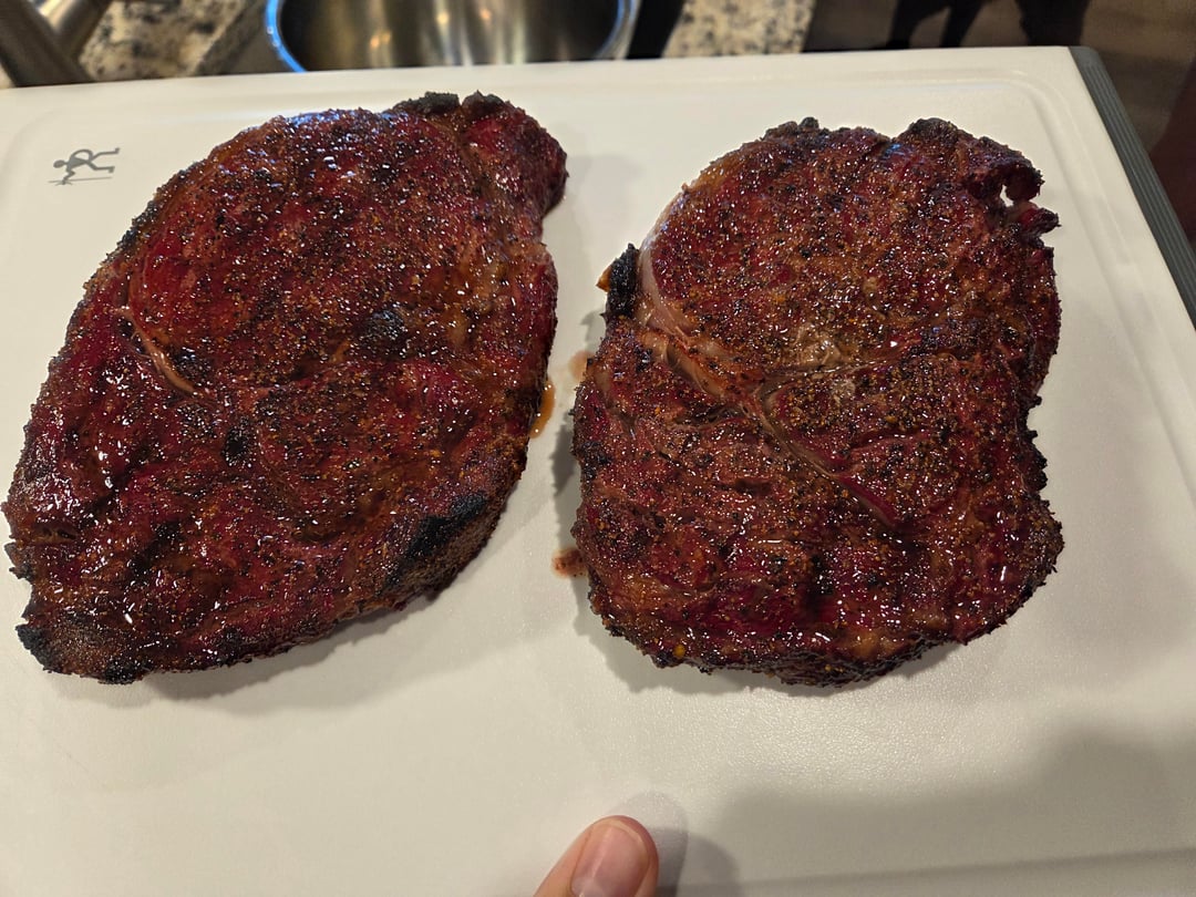 Poormans burnt ends, goat cheese & date with bacon dip, 2 ribeyes. My thermometer spike died in the middle of the cook, so I guessed on doneness. But all turned out fantastic still. Thought I took a few money shots, sorry.by Darth_Boognish Dining and Cooking