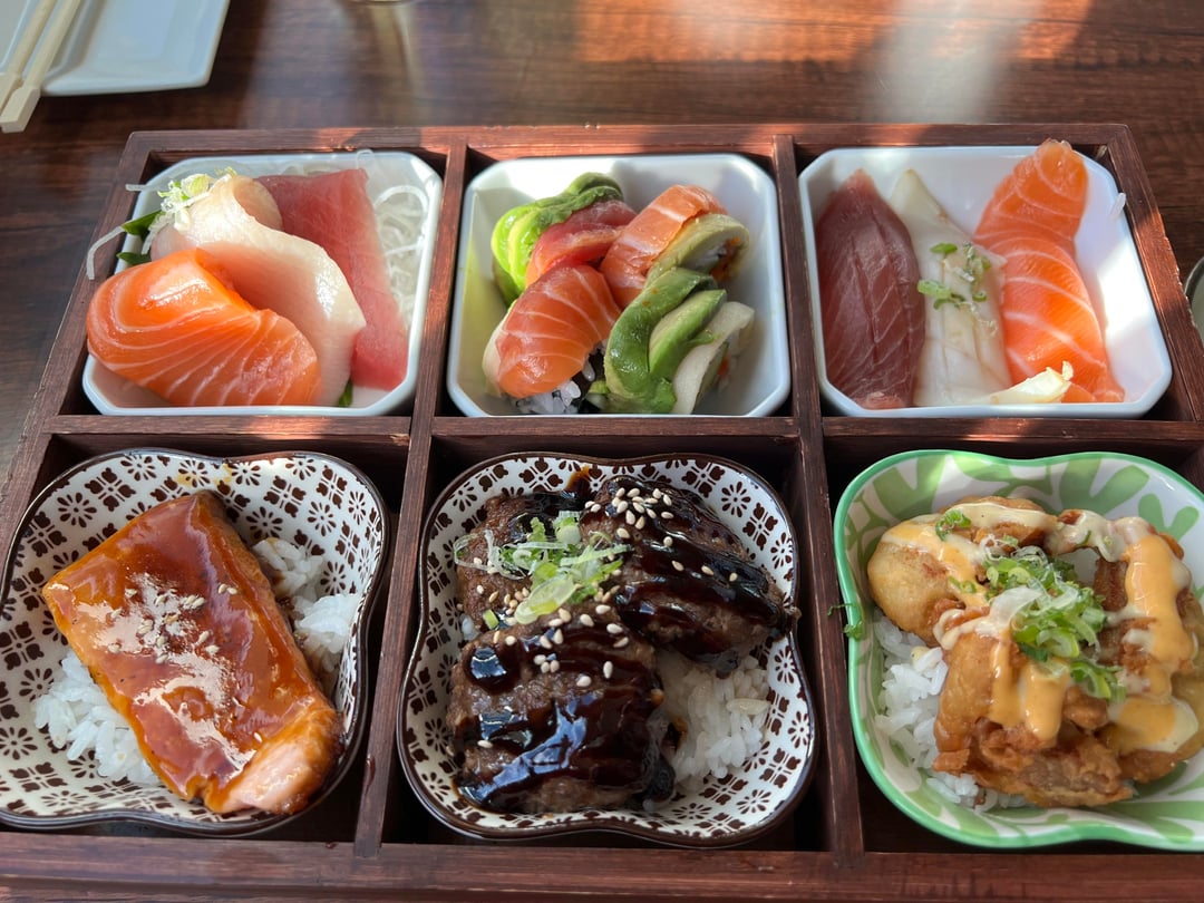 Top left to bottom right: 3 sashimi, 4 rainbow roll, 3 nigiri Salmon teriyaki, Little beef patties, Chicken KaraageAlso miso soup/salad (not pictured)by ethan0077 5 Comments OiFogazzi 2 months ago  DenseInfluence4938 2 months ago Looks incredible! NicholasCagescape 2 months ago $2 pp seems great. Any idea what the same selection would cost at dinner pricing? lonelygoat44 2 months ago https://preview.redd.it/o6hq8a1o4f5g1.jpeg?width=1170&format=pjpg&auto=webp&s=a2e036305fa5adf528e97566a0d31d140da7a72d Low-Feedback-1688 2 months ago Presentation looks amazing!!