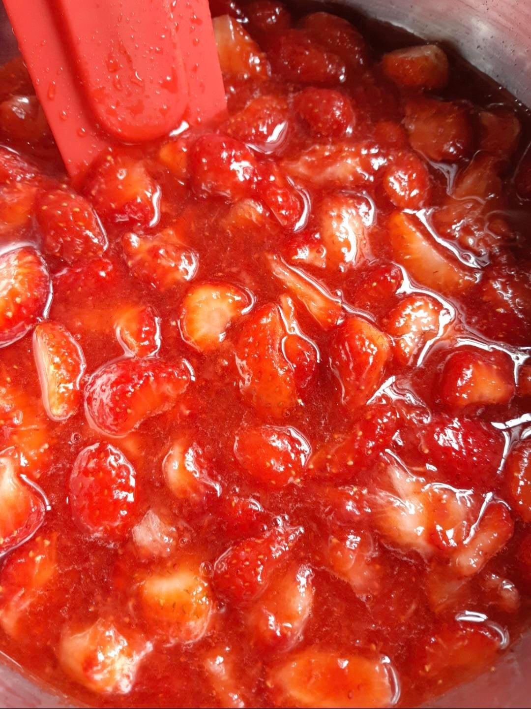 In addition to the jam, I made some strawberry confit (for those who don't know, confit is a bit like preserved fruit – that's where I got the syrup to use in the frosting).