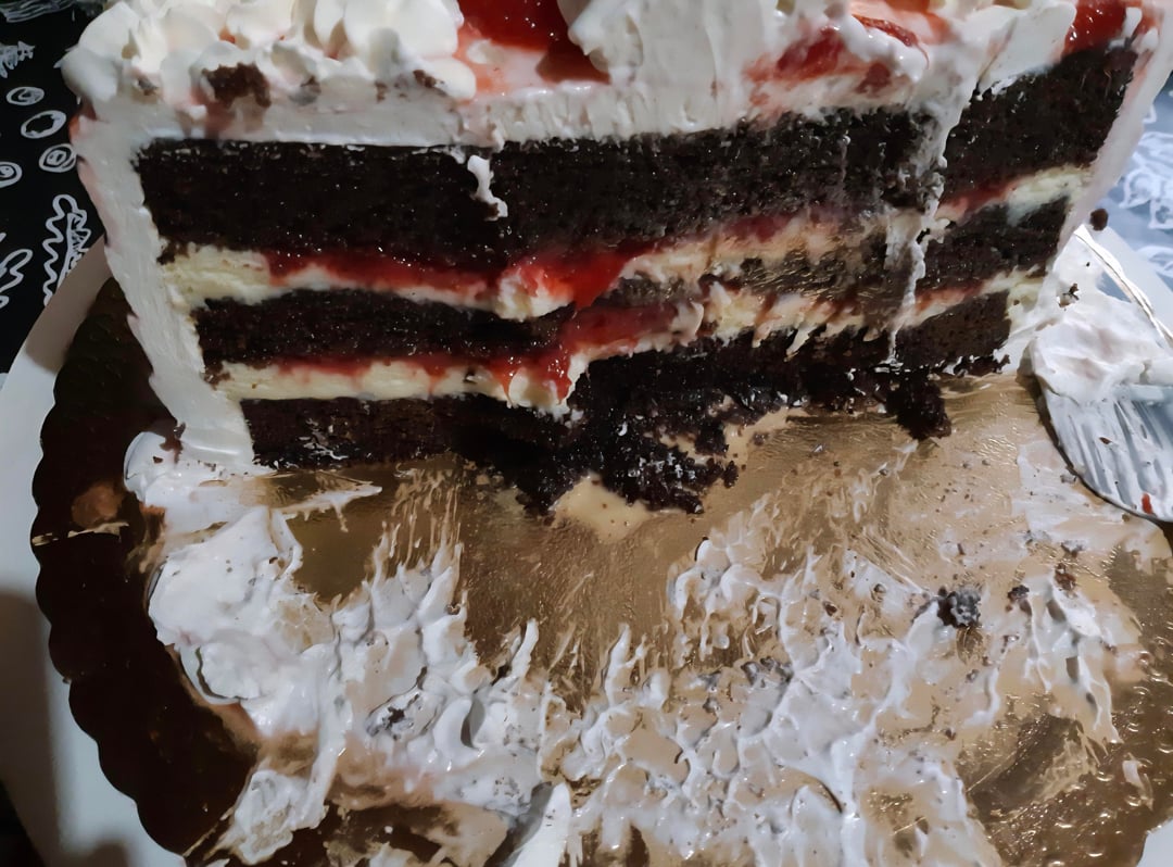 Chocolate cake (made with alkaline cocoa) and cream filling with strawberry jam (homemade because I find the store-bought kind a little too sweet) and whipped cream frosting with homemade strawberry syrup.