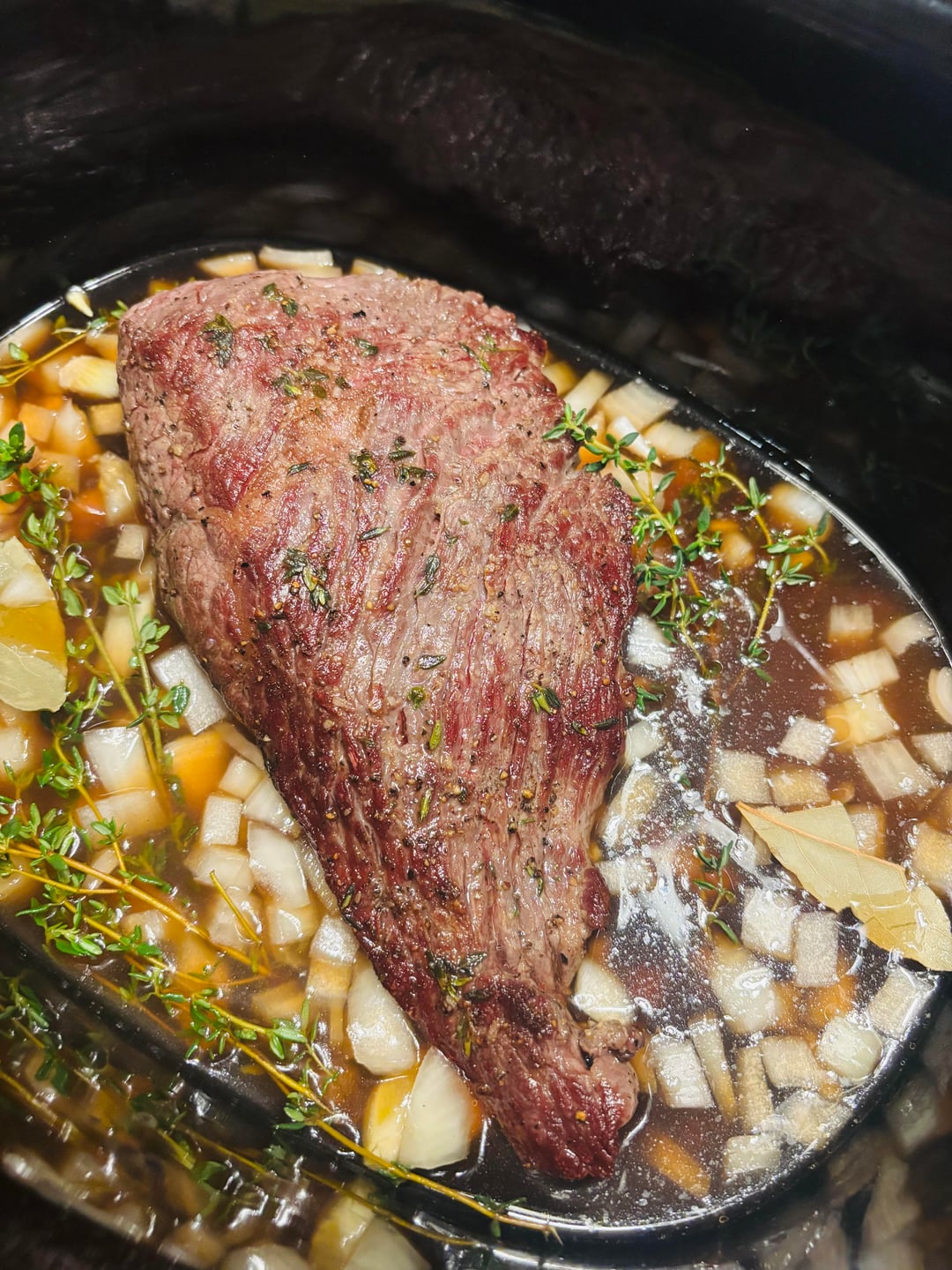 Set in slow cooker on top of a whole diced onion and two smashed cloves of garlic. I added roughly 2 cups of beef broth, a splash of red wine vinegar, splash of Worcestershire sauce, and more fresh thyme. Cook low for 8 hours.