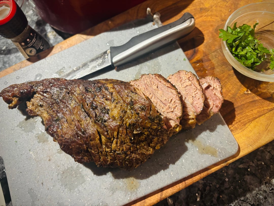 Once done while the brisket rested, I made a sauce from the cooking liquid. First I sautéed some cremini mushrooms (sliced), added minced garlic, then deglazed with a couple ladles of the cooking liquid (with onions still in). Added some heavy cream, whisked in about a tsp of Dijon mustard, a tsp of Worcestershire sauce, and then some lemon zest + juice of about half. Finished by folding in chopped parsley.
