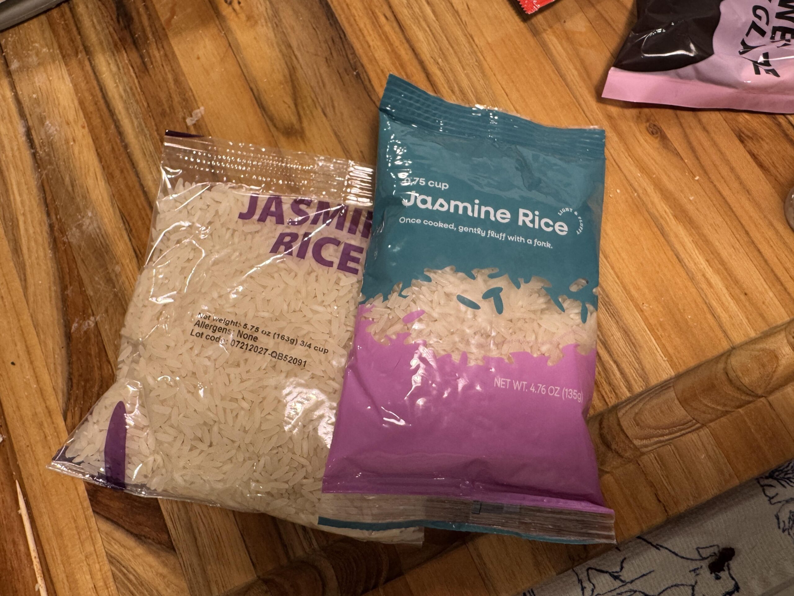 We like to do a little more rice so will use our own and then I’ll eventually combine two recipes’ worth together. I noticed today that both jasmine rices are labeled as 3/4 cup but the new one is an ounce/28g less.
