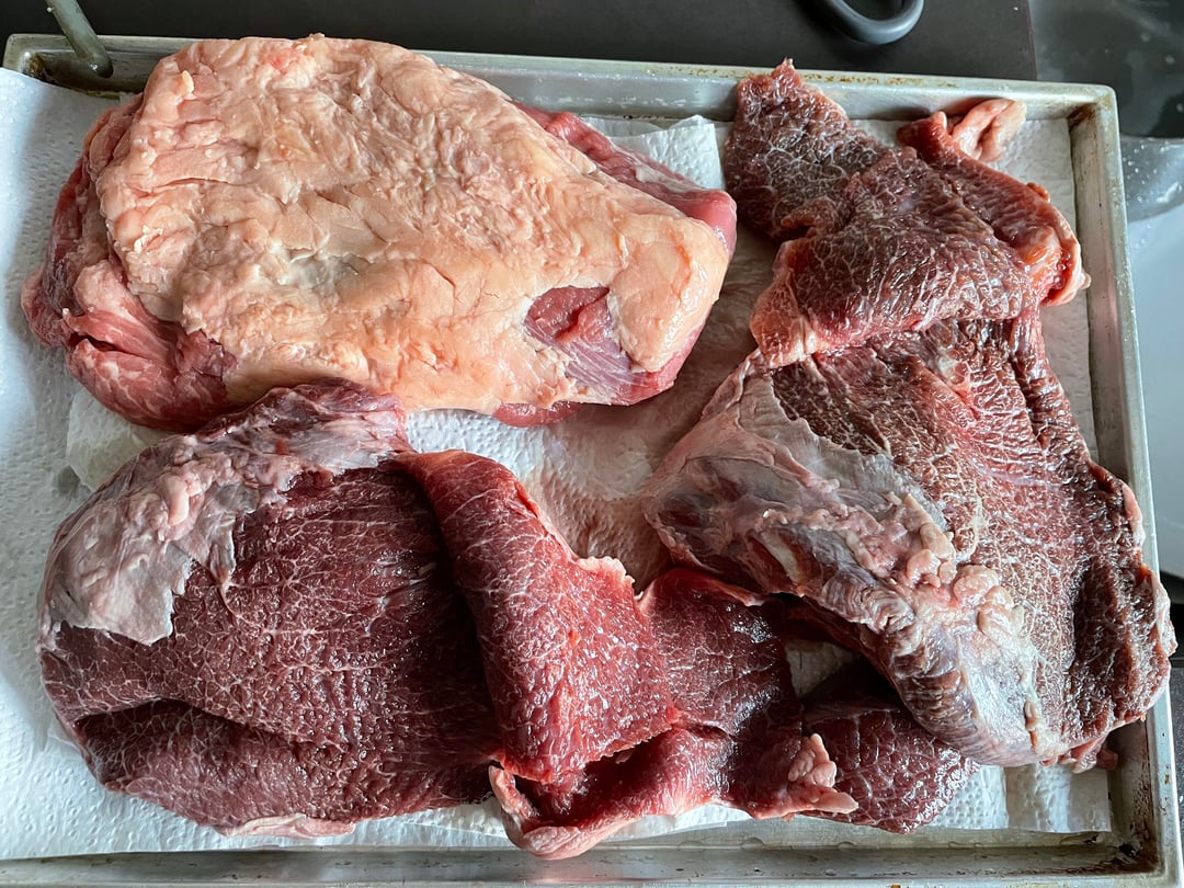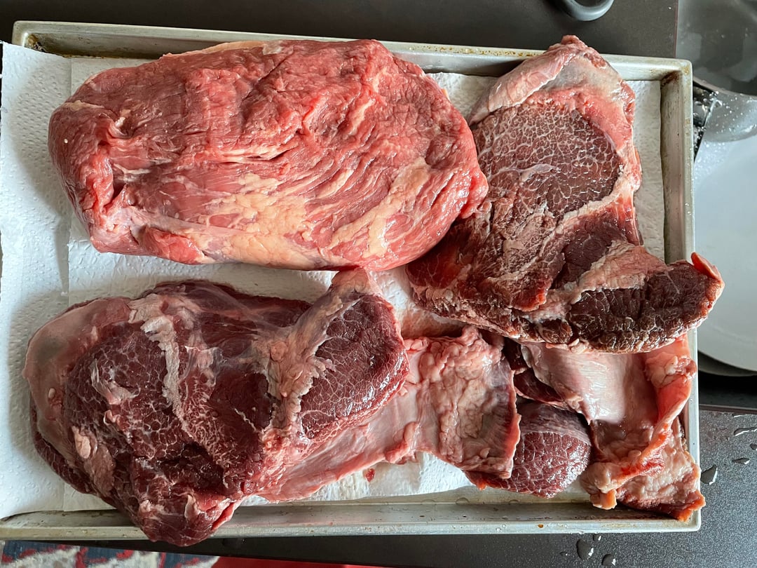 You got a couple of beef cheeks and a tri tip. Grill, smoke or roast that tri tip.