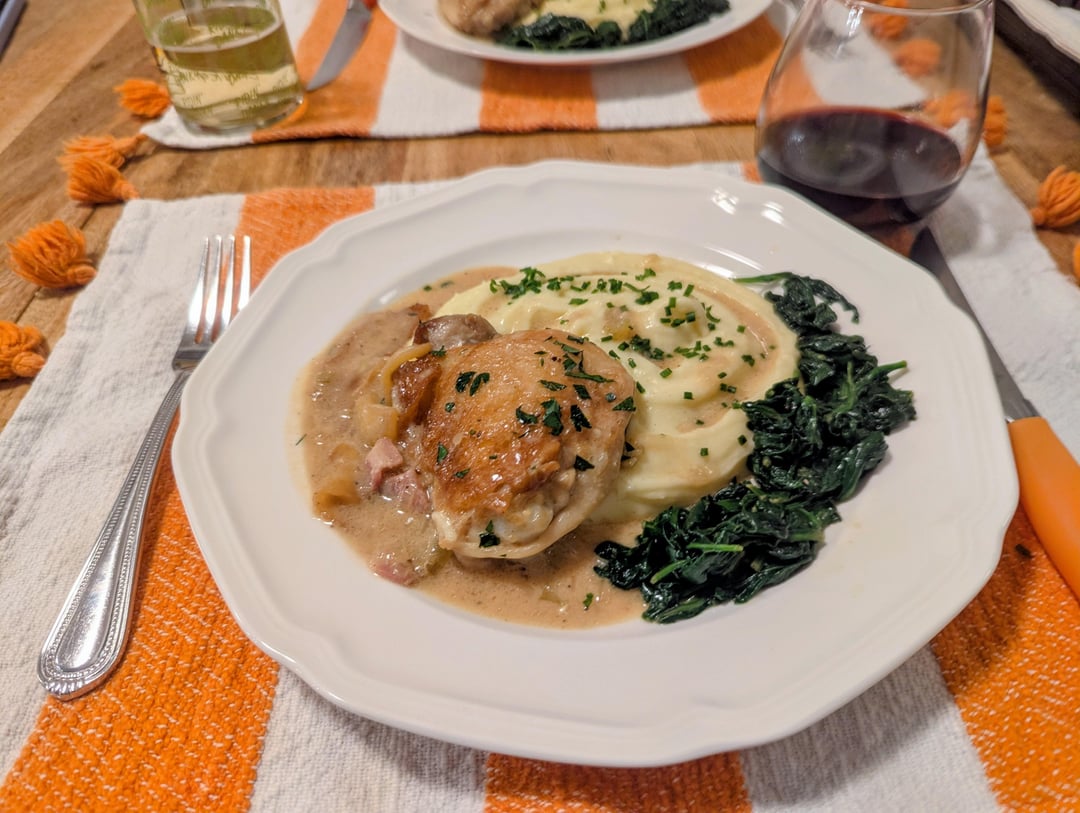 French chicken casserole (Poulet a la Normande) with Michelin potato puree and sauteed spinach 😋