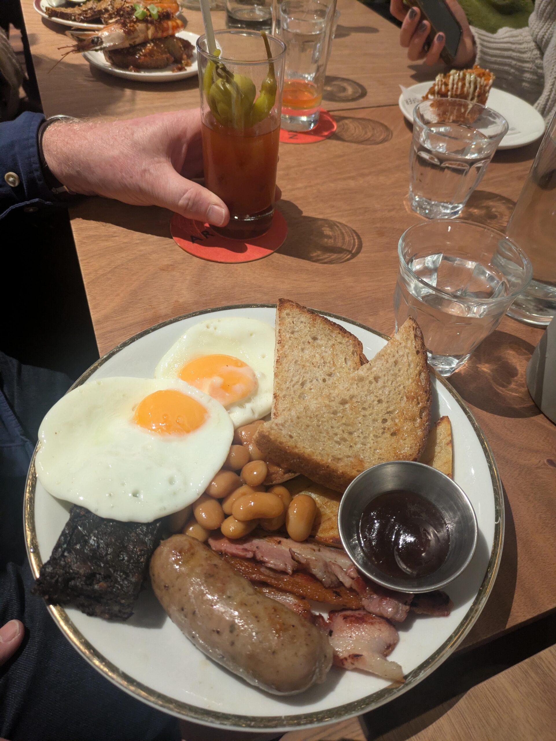 Full Scottish – Back bacon, Cumberland sausage, hare haggis, tattie scone, beans, fried egg, toast, brown sauce