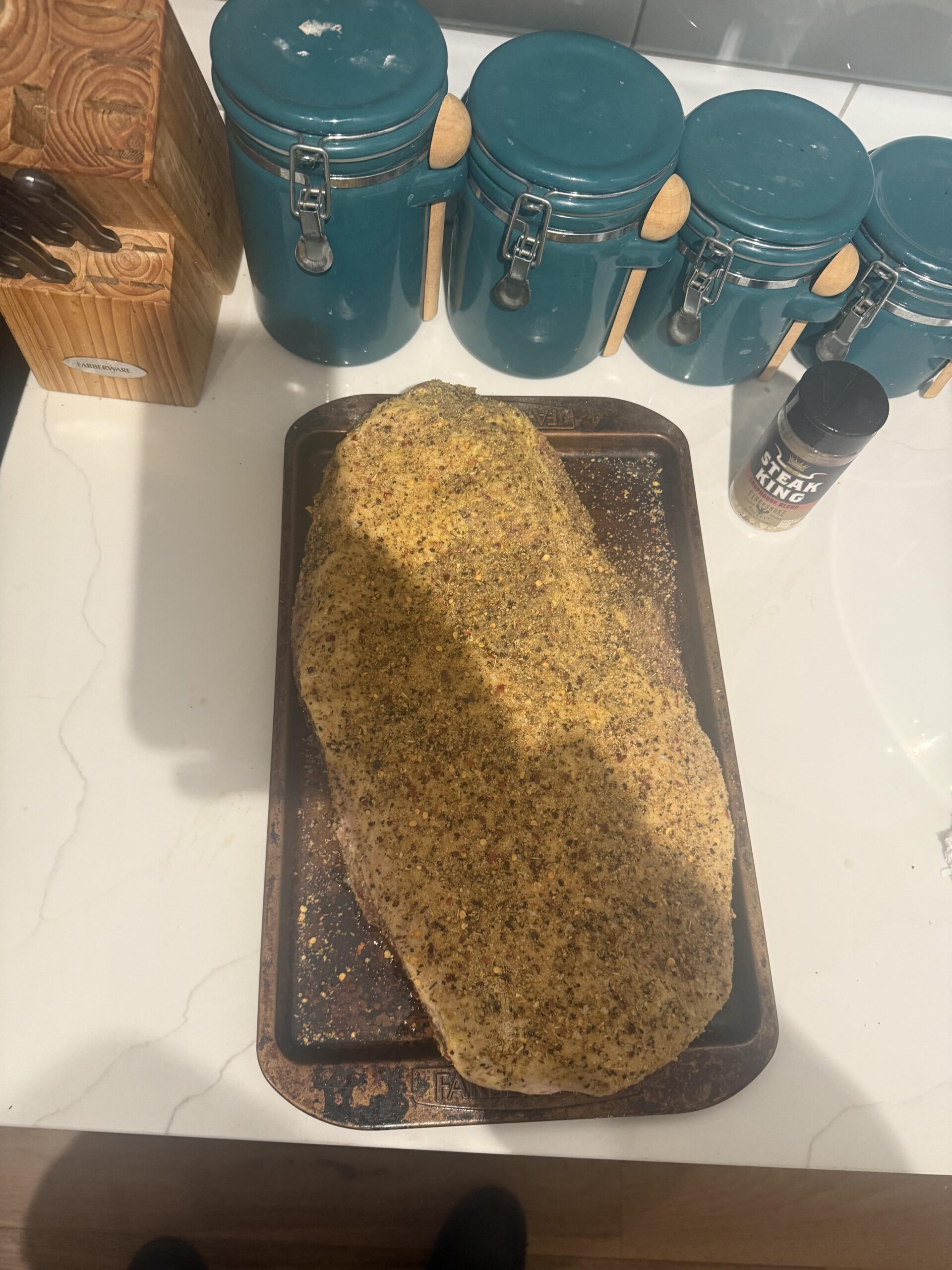 Slathered it in mustard, seasoned with the sea salt, garlic and some Fire and Smoke chophouse blend. It’s been sitting in the microwave like this since 7 probably, gonna plan to put it on around 10:30.