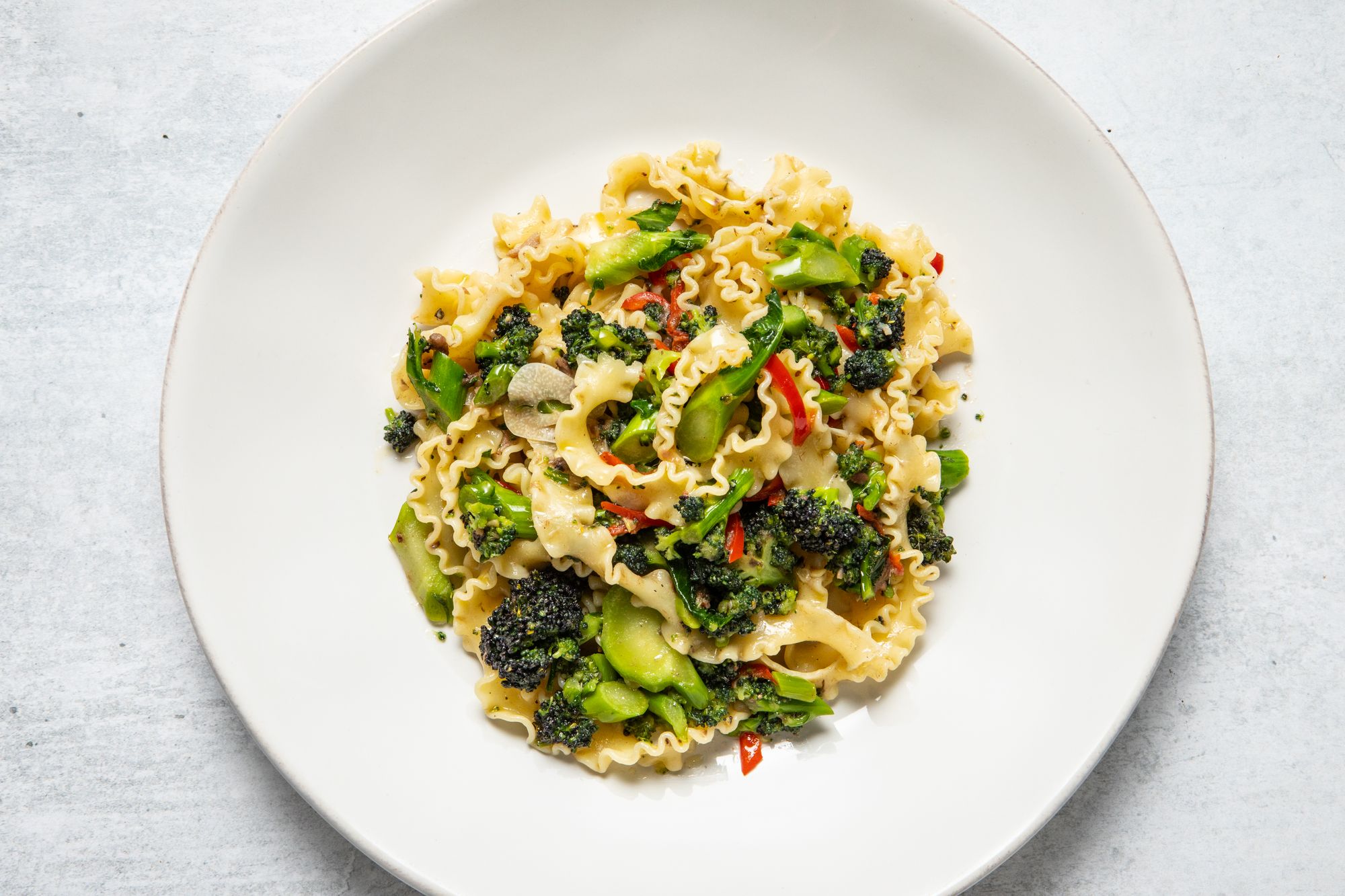Reginette with purple sprouting broccoli, anchovy, chilli and garlic