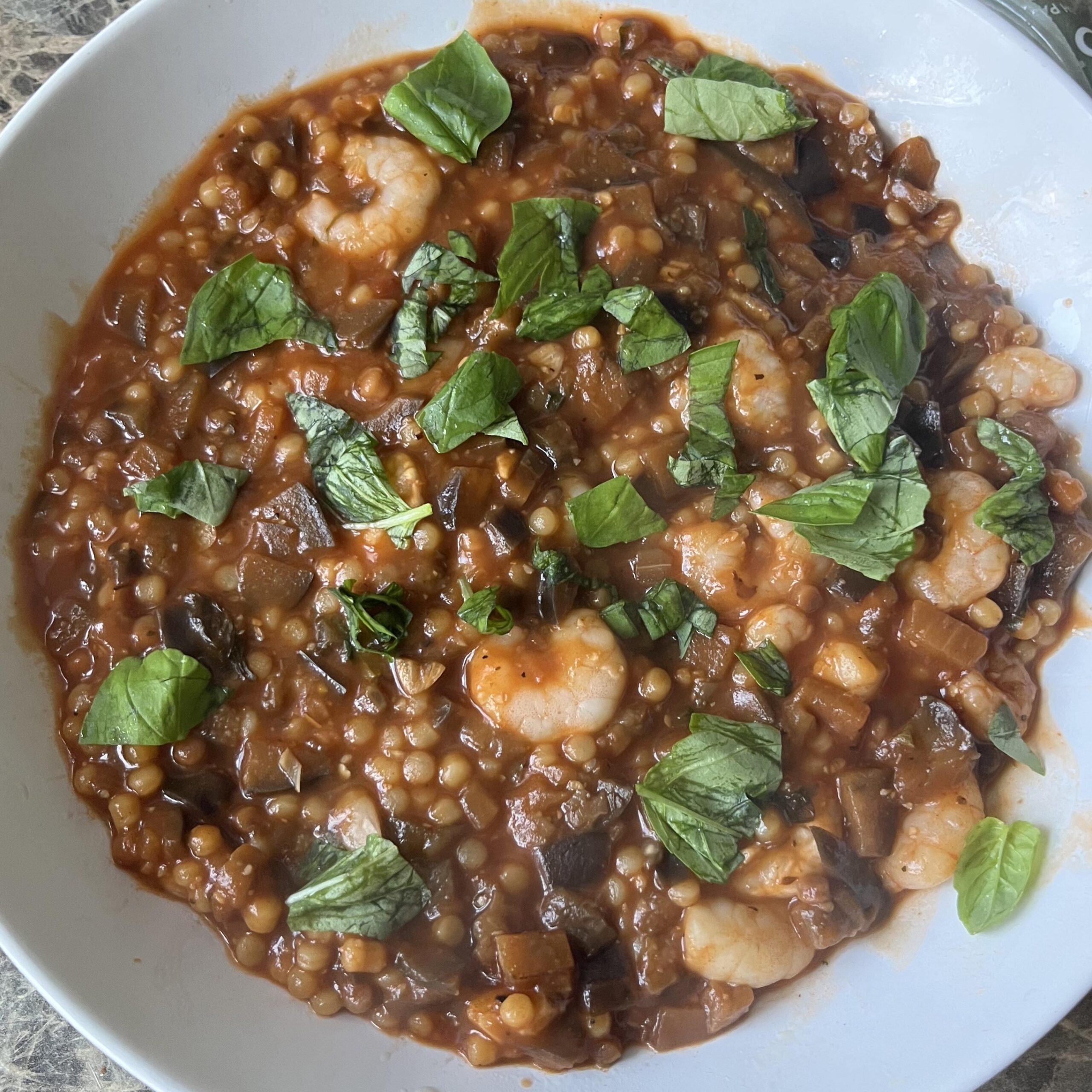 Minute 10-25: Add aubergine, passata and fregula, stir fry for 3 minutes, add water little by little and cook like you would risotto. Garnish with basil.