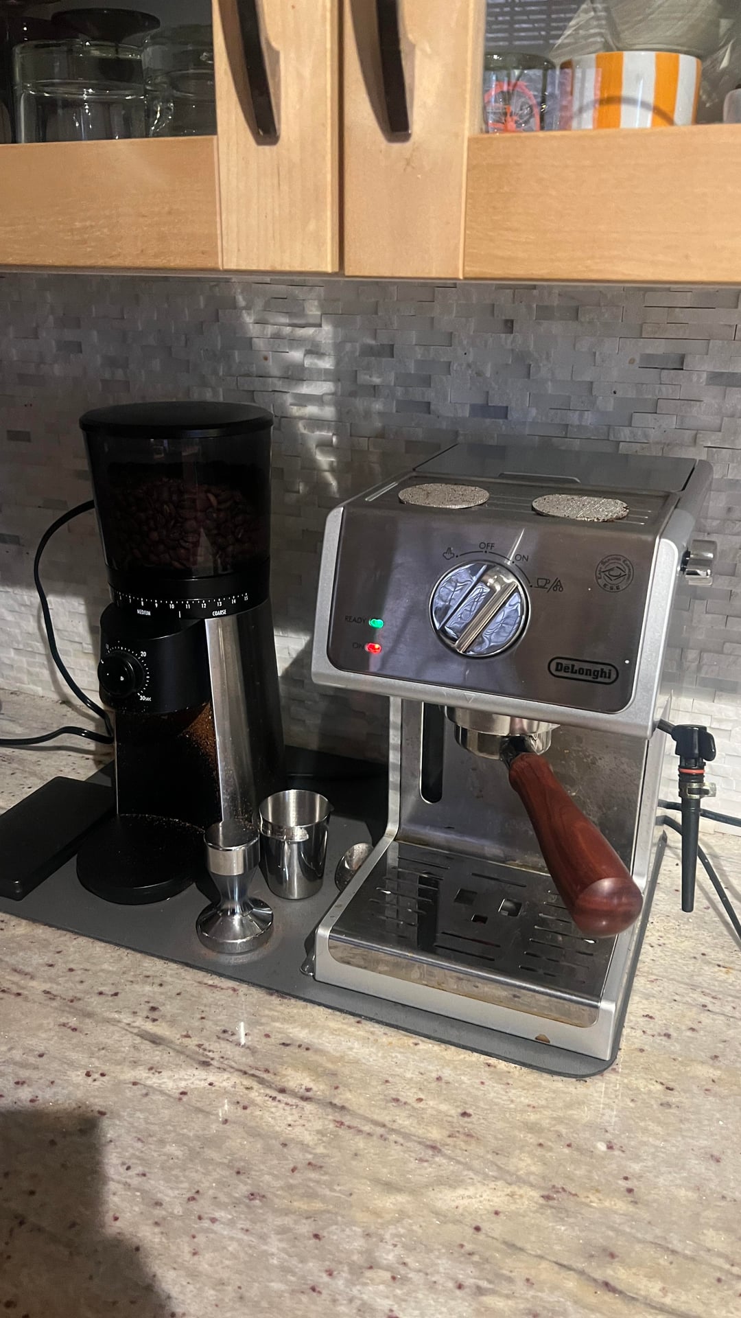 I had already had the oxo grinder since I was making mostly pour overs at the house. I then saw a post about this Delonghi ECP3630 and people were saying it wasn’t a bad machine, the person also got it for like 40-50 dollars. I found one for 60 on eBay pretty much brand new. I upgraded the steam wand and the portafilter. It does a pretty good job at making a cappuccino. I think the whole setup is under 200. I do want to upgrade the grinder eventually.