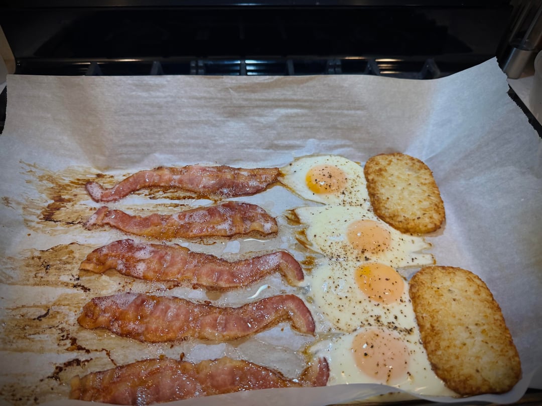 Bacon crispy, egg whites set, yolk runny, hash browns could have been a little crispier, but not bad for one pan all on the same cook time by runs_with_airplanes Dining and Cooking