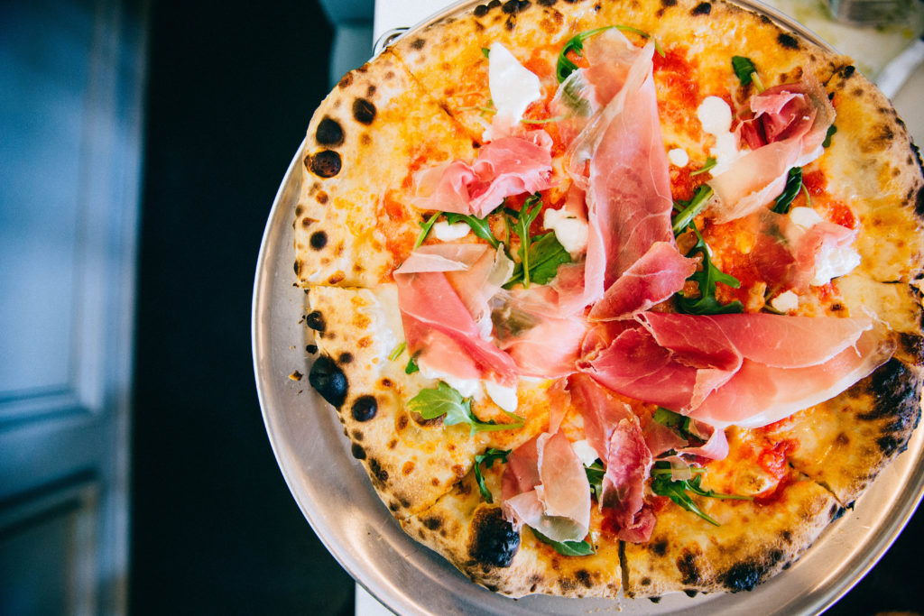 The Prosciutto pizza with burrata, mozzarella and arugula