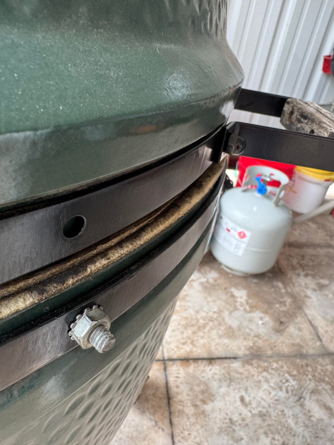 Welcome to the kamado lifestyle. You’ve got an older model for sure with the old band and hinge and daisy well vent cap. They should still work fine but pay attention when you open and close. The daisy wheel vent might move around and you’ll have to adjust your openings. Also, the old bands don’t have a couple of “feet” to help secure the top better. I lost a dome once when the old bands heated up. As for the underbite, you do need to adjust a bit. most loke your bottom band needs to come up slightly to push it forward. They used to provide these plastic pieces to align the bands, but with the new packaging they no longer do that as the bands come pre-attached to the base and dome. It makes final assembly easier.