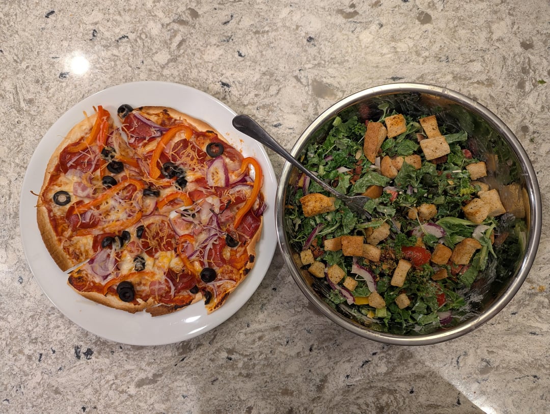 Huge salad and pizza, 823 calories for both, 88g protein and 45g fiber