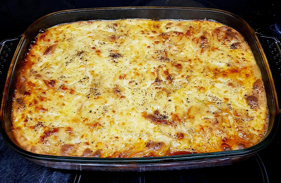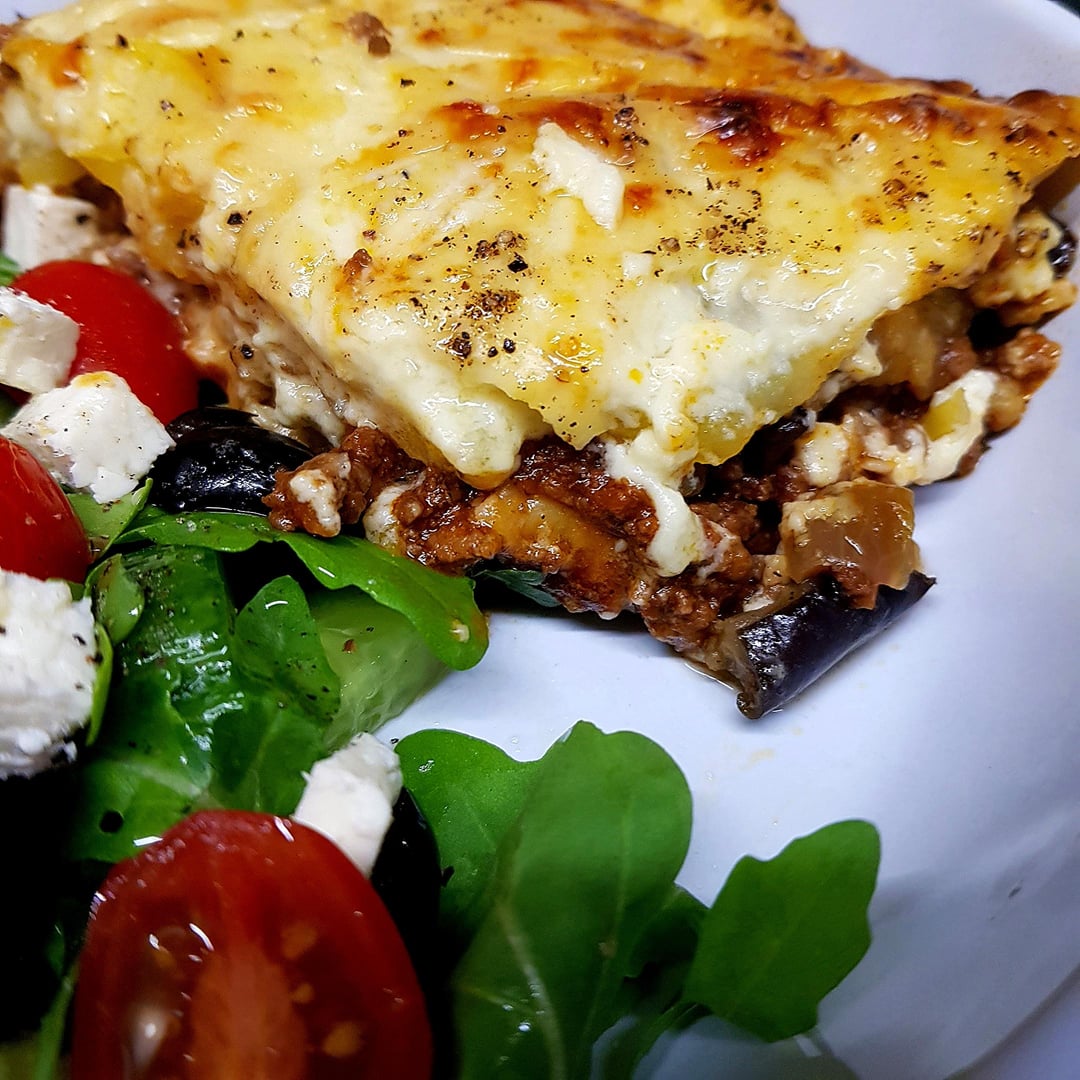 Mousakka. Topped with an Egg Bechemel and Greek Salad on the Side.