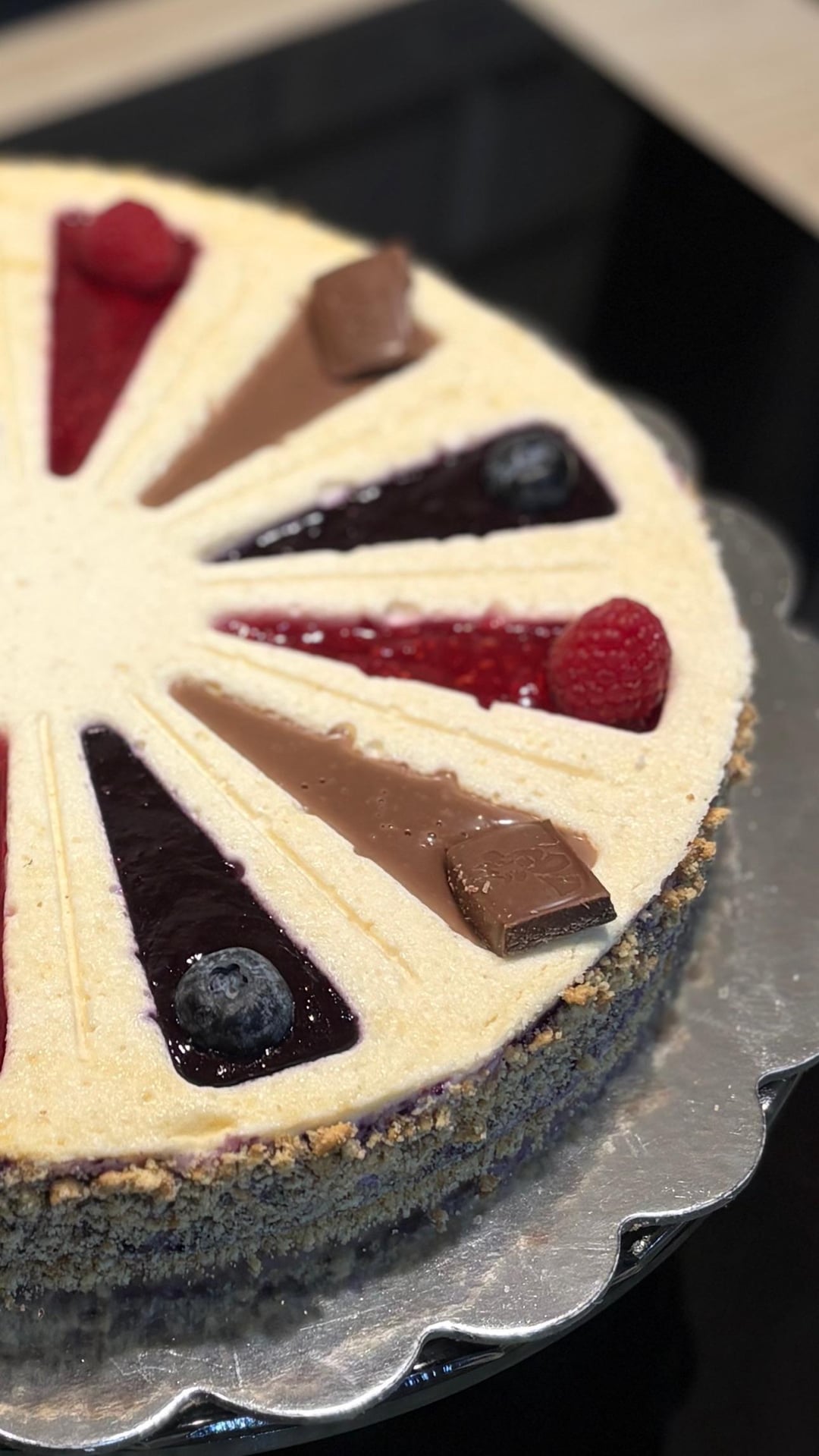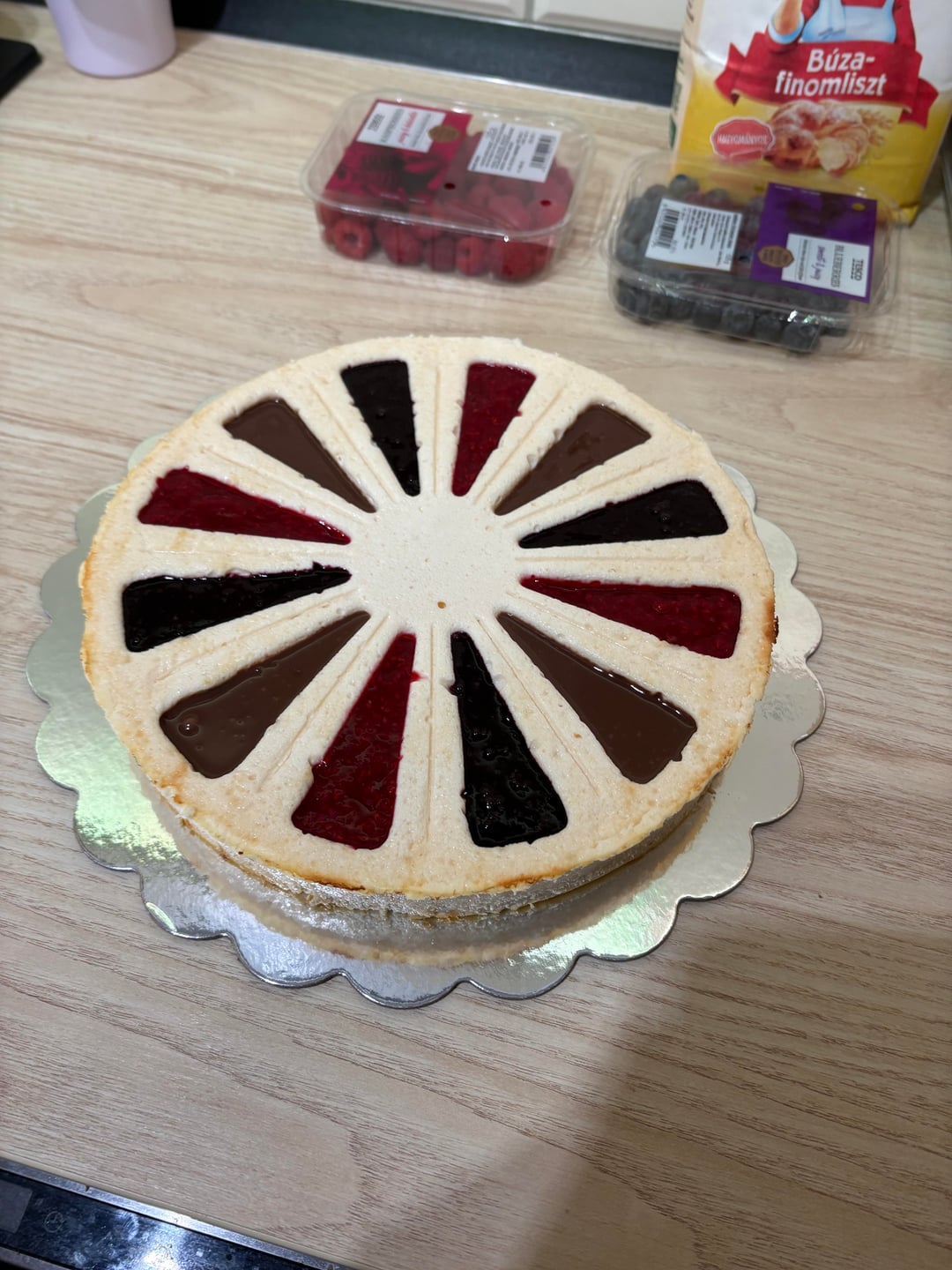The base is a lactose free baked cottage cheese cake without added sugar. I used two sugar free fillings: raspberry and blueberry. The third filling is milk chocolate cream.