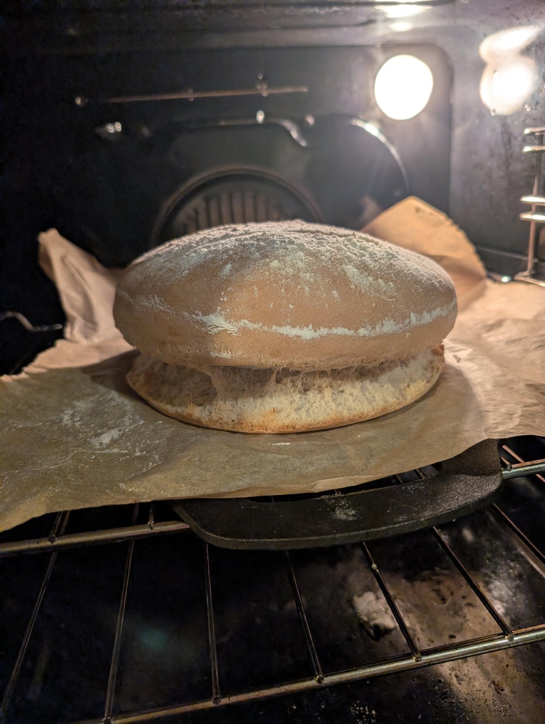Shape and proof in oven for 30 minutes. At this point it became a pancake. I currently have nothing to cover dough in the oven with for the proof as my mixing bowls are plastic and I don’t want to stick my expensive kitchen aid bowl in the oven.