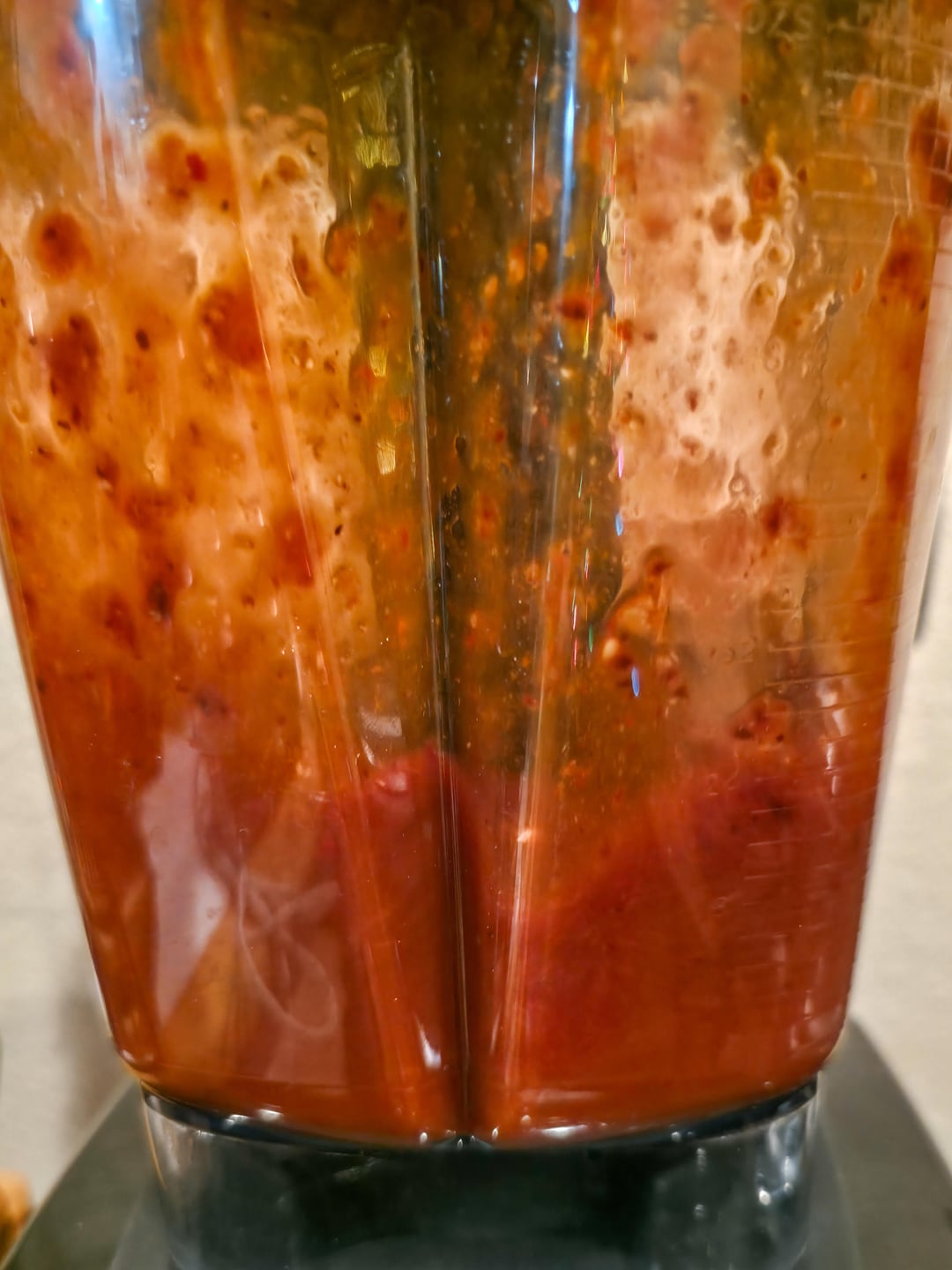 * Put [peeled] garlic, chilis, and some of the soaking water in blender and blend on high until smooth.