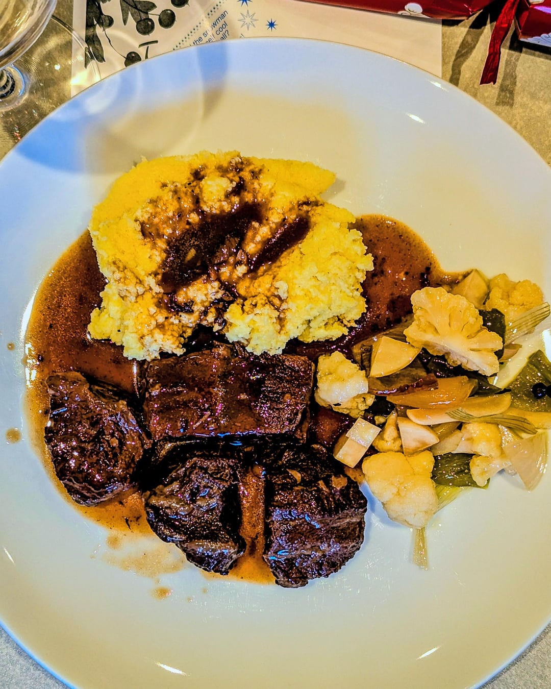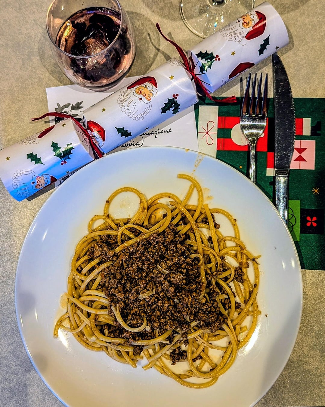 Christmas lunch with friends. Gin tonic with fermented blueberries, bucatini with duck ragu, barolo beef stew with fermented vegetables (giardiniera), panettone with tiramisù cream