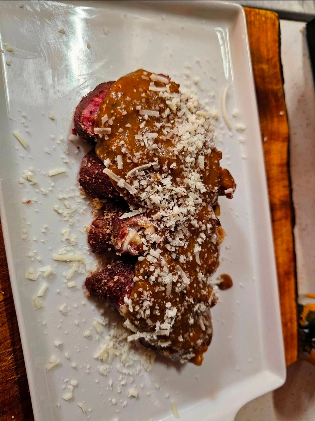 Slice, cover w/ gravy, sprinkle some fresh grated parmesan and scallions, then enjoy!