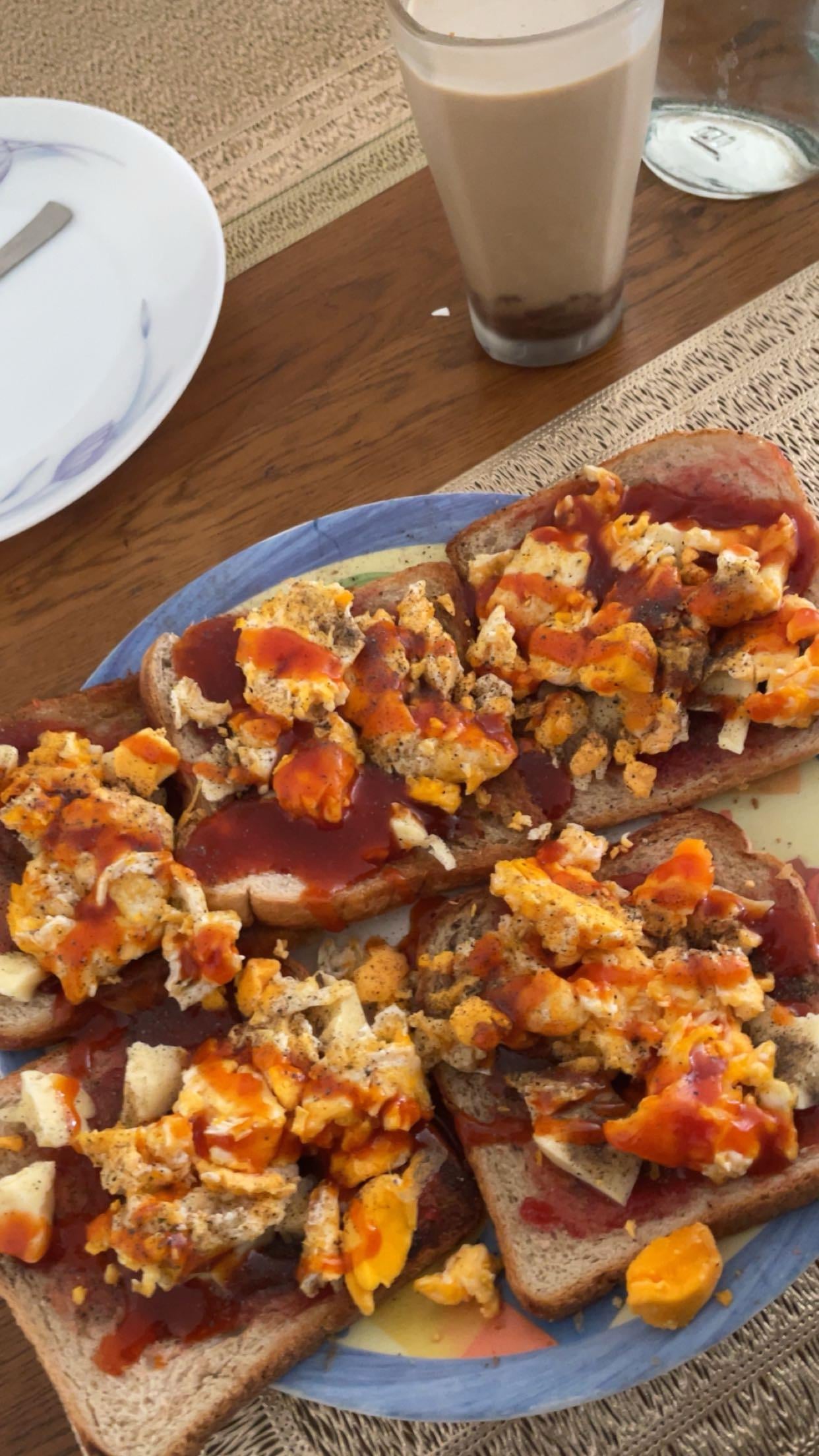 5 slices of wheat toast with butter and jam and cheese, 5 whole eggs + 1 egg yolk, vanilla iced coffee with milk and raw sugar. by ruinsofsilver Dining and Cooking