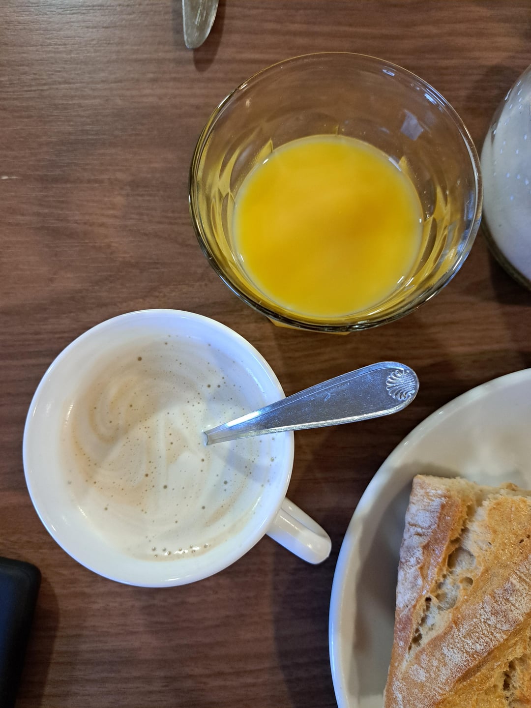 it's a croissant (medium sized) and baguette + milk with coffee to drink (don't mind the juiceby Left-Layer5525 1 Comment Goodie_2-shoe 3 days ago croissant – 300-450bread – 170 -200milk & coffee – 40I would say 520-700 calories, but it looks like it’s probably on the lower side of that.