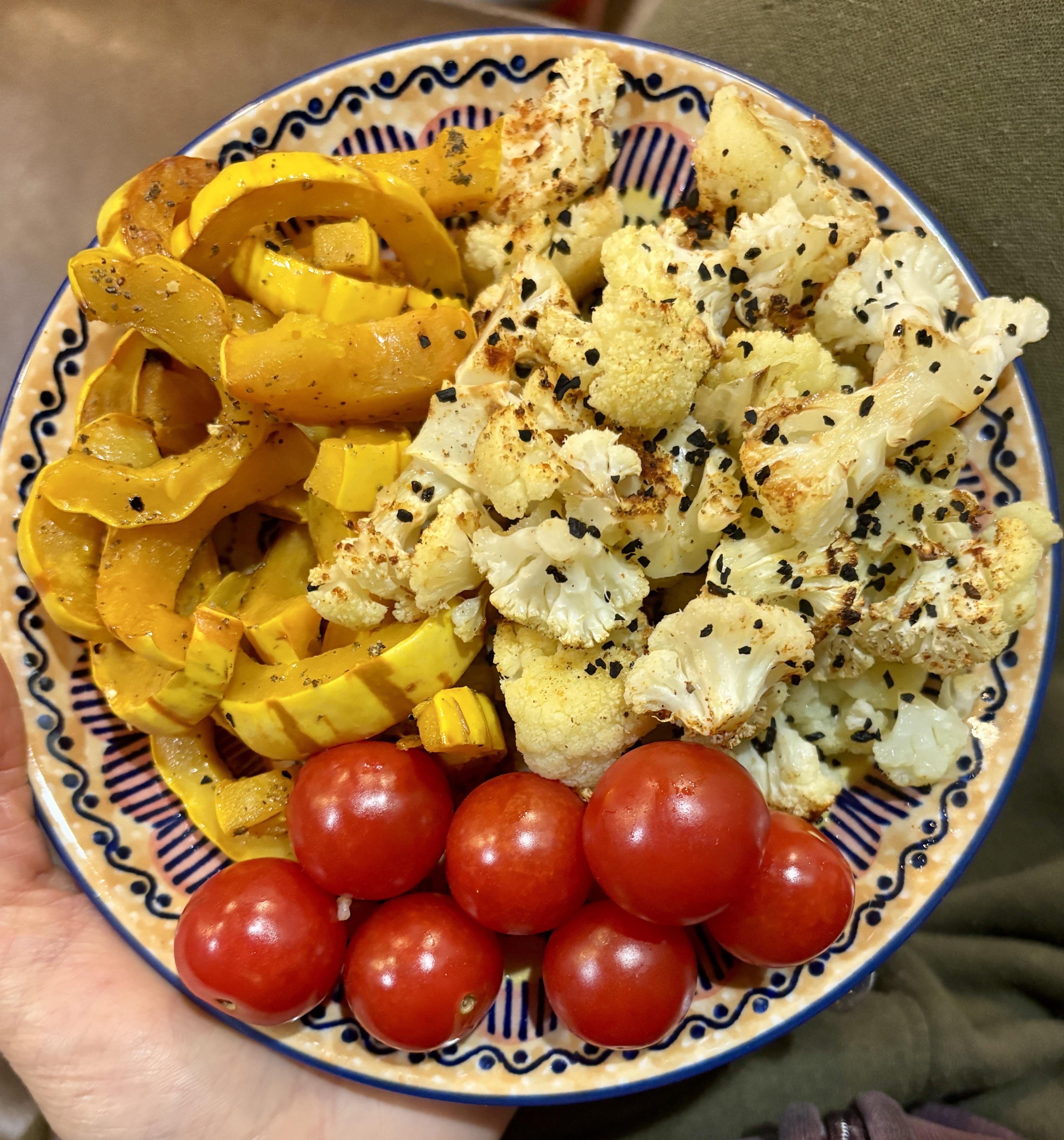 Cherry tomatoes, roasted delicata squash with lemon and sage, roasted cauliflower with black garlic and paprika. Don’t sleep on delicata, holy cow. Almost like caramel!