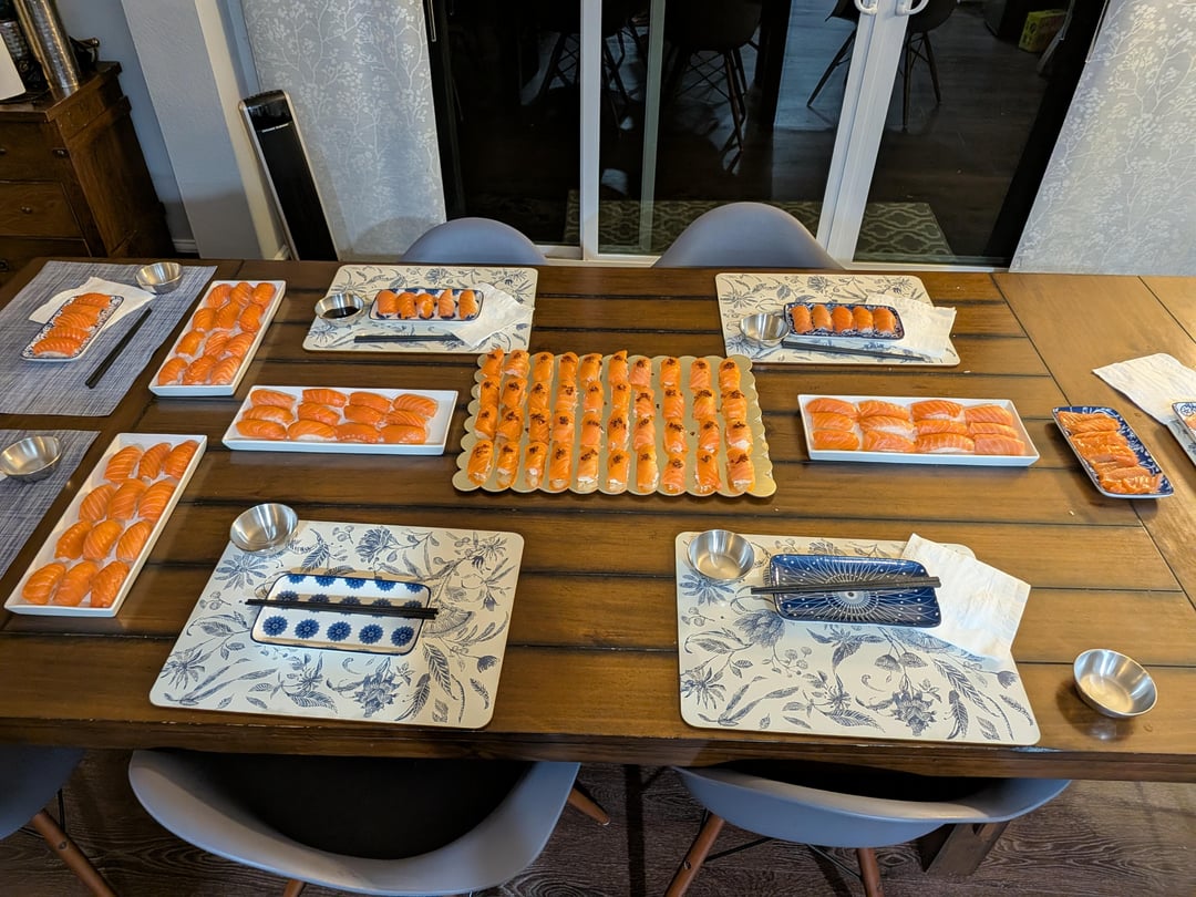 103 Nigiri pieces and a few sashimi from a total of 3 Costco packages. The whole family loved it including a 6yo.
