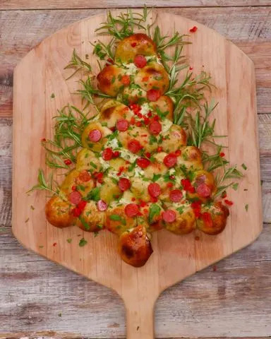If you’re the type of party guest who strives for show-stopping presentation, this appetizer is for you. With a cream cheese-based filling, pesto, mozzarella, and a garlic-butter glaze, this tree-shaped pull-apart bread is both delicious and impressive to look at.