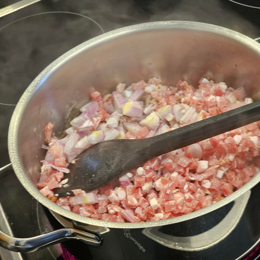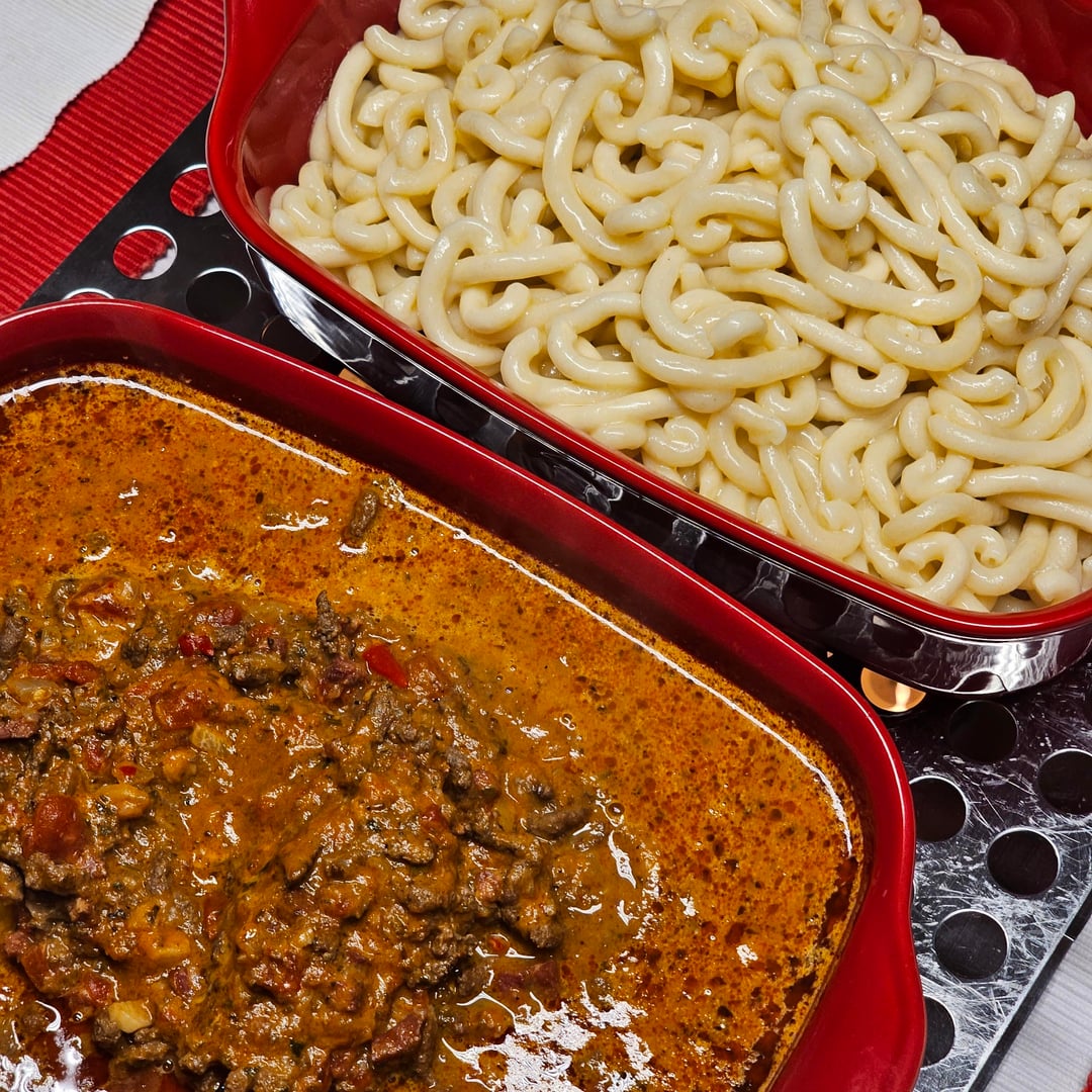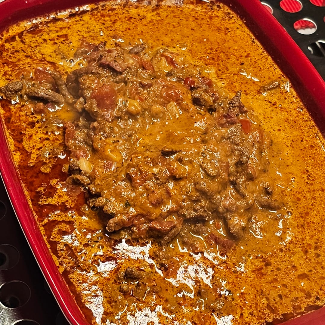 Hashed beef, diced cured ham, onions, garlic, tomato puree, hashed tomatoes, oregano, chilies, red wine and your favorite spices to taste; added some cream like 15 mins. before serving. Yup I think that was all.