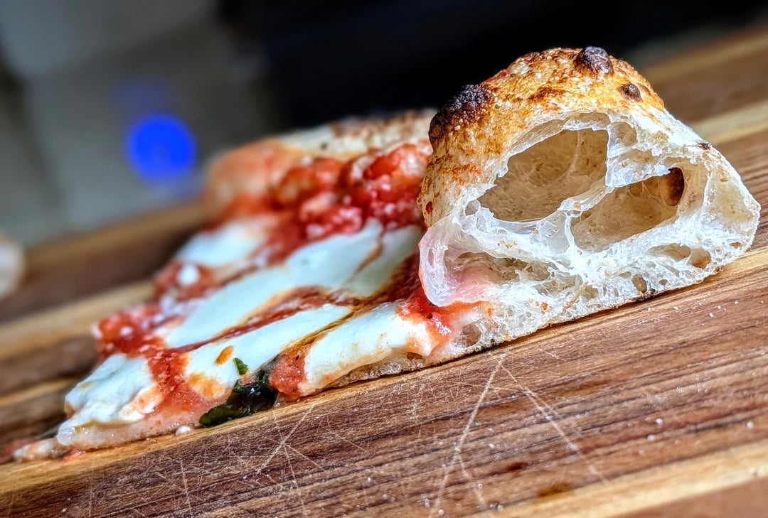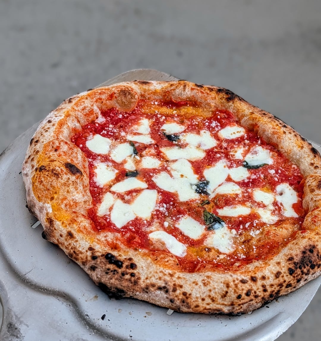 Mixed, and bulk proof 24hrs. Ball on second day and sat in fridge for additional 4 days (roughly) Cooked in Gozney Roccbox 900f for 90 seconds.