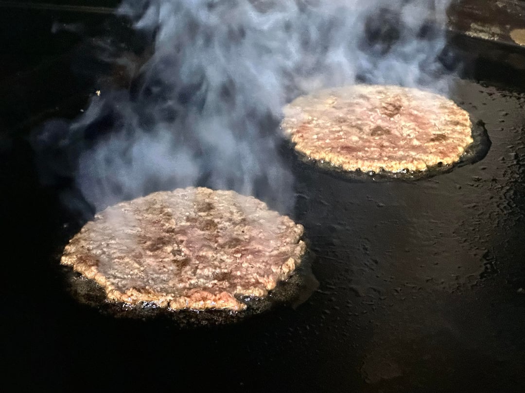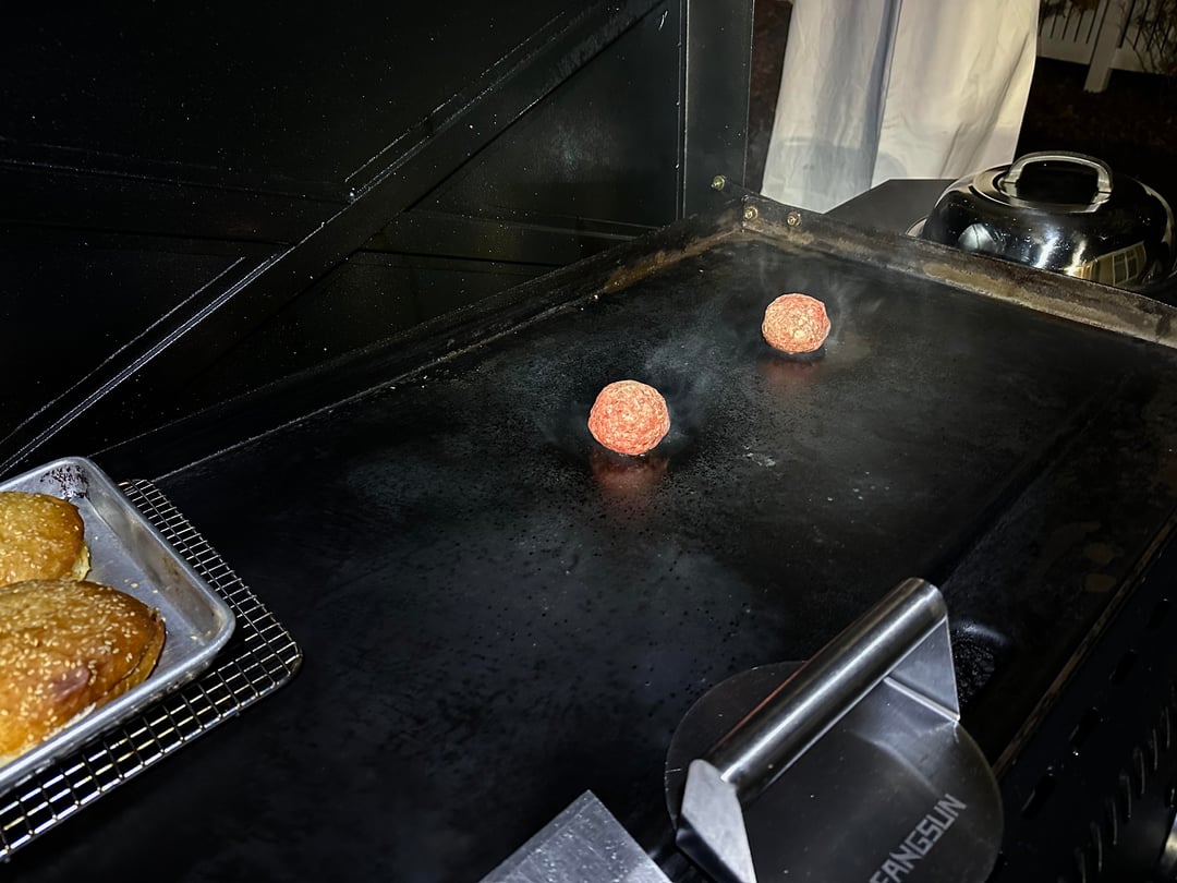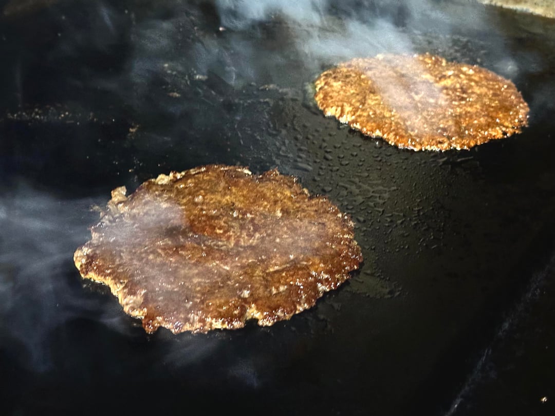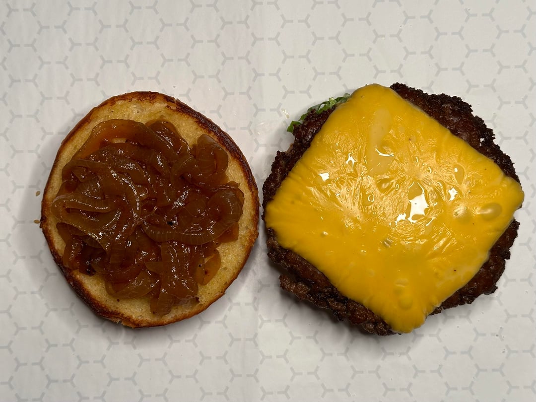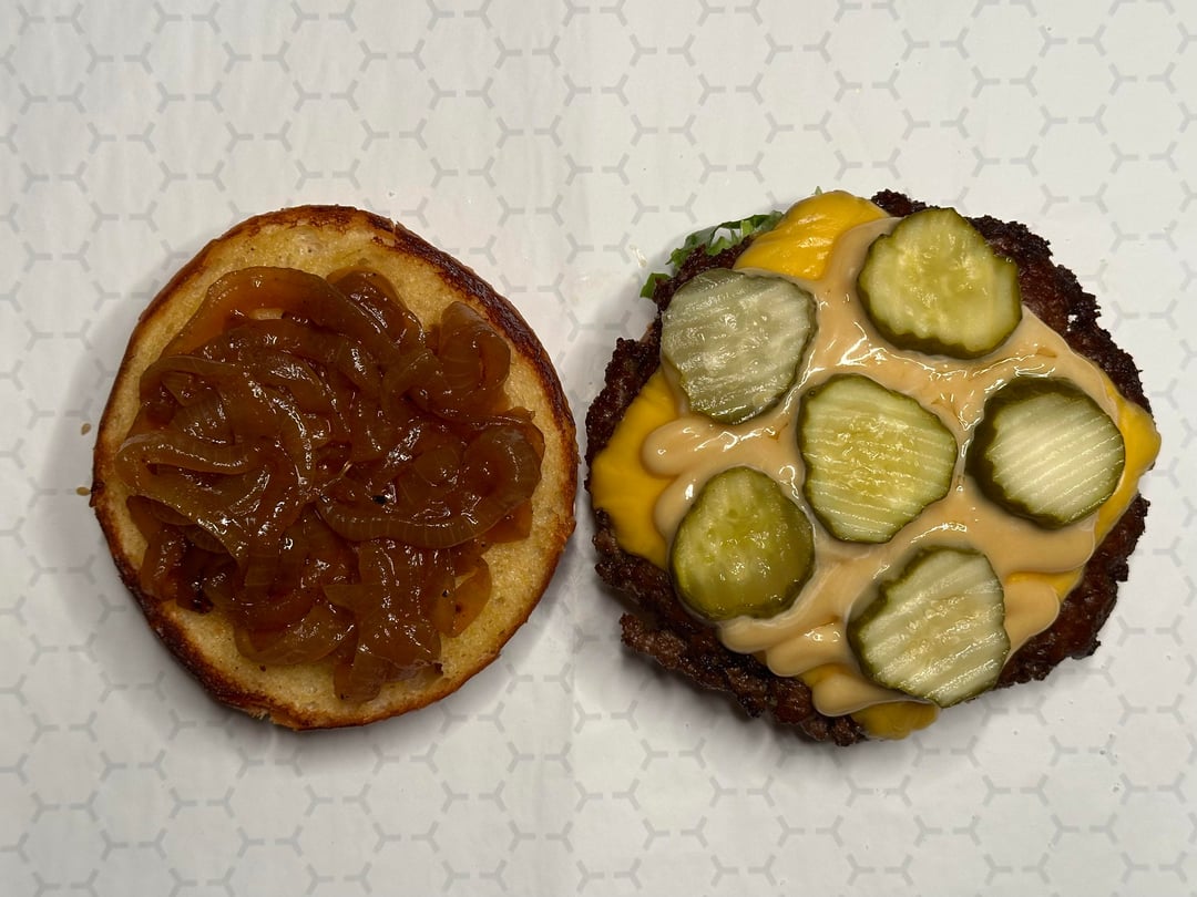 Burger night! This week’s special was a single home ground chuck and flatiron smash patty with two slices of American cheese, sweet and spicy pickles, a pile of onions sautéed in bacon fat, my maple mustard sauce, and some Jalapeño ketchup, on a buttered and griddled homemade bun.