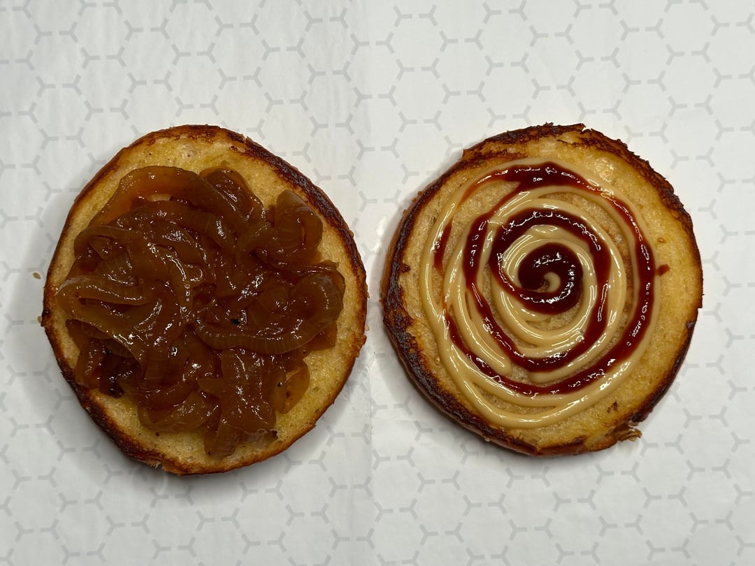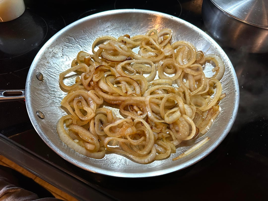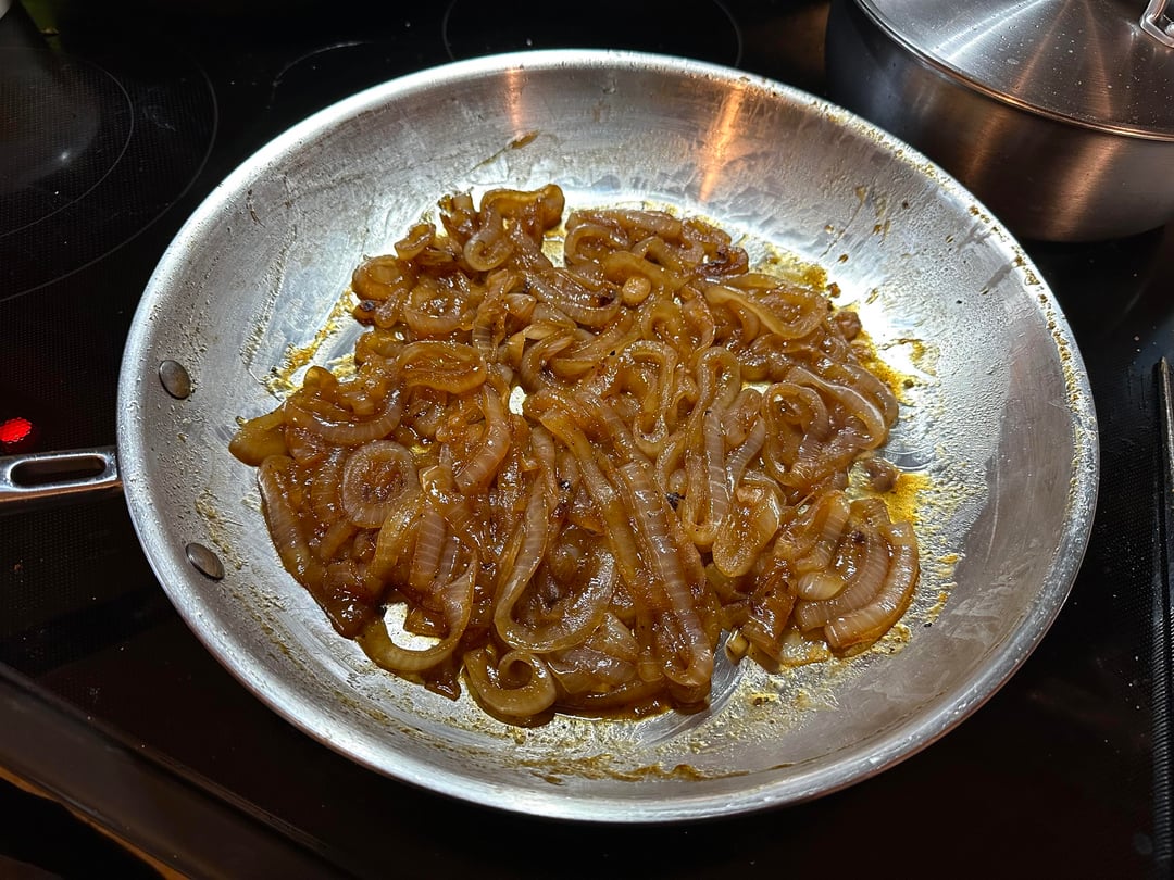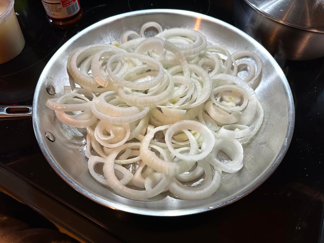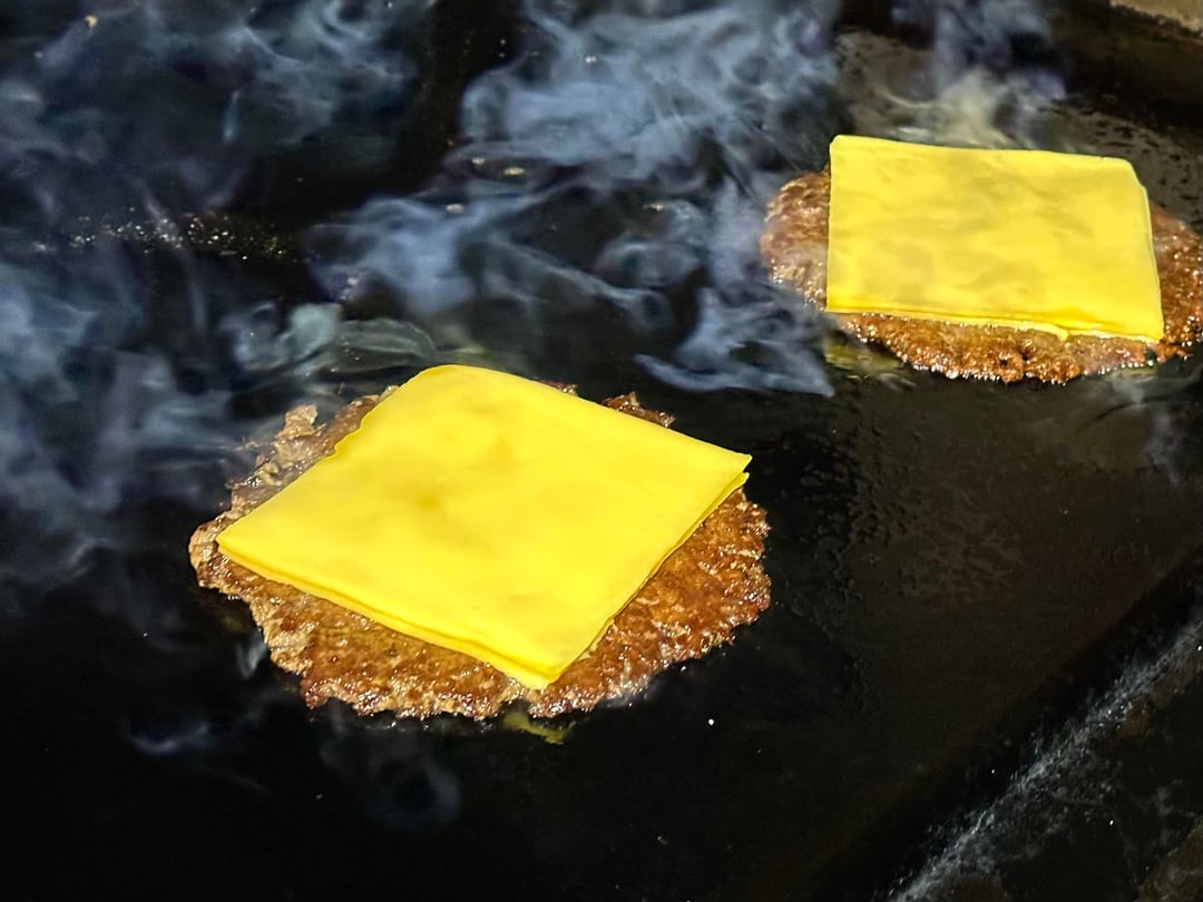 Burger night! This week’s special was a single home ground chuck and flatiron smash patty with two slices of American cheese, sweet and spicy pickles, a pile of onions sautéed in bacon fat, my maple mustard sauce, and some Jalapeño ketchup, on a buttered and griddled homemade bun.