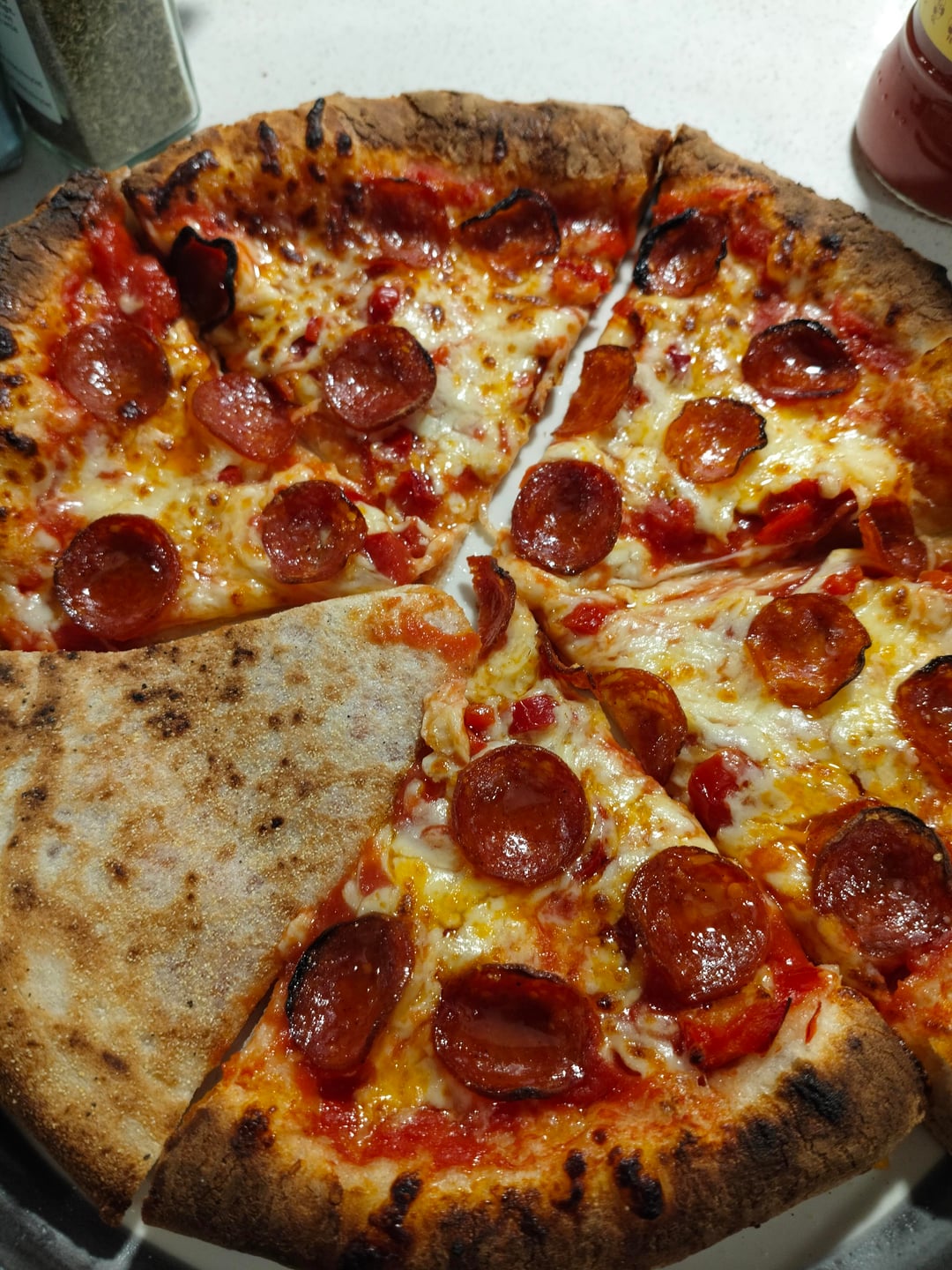Toppings in order of layers. Mutti passata, herbs, hot sauce, diced red jalapenos, grated mozzarella, small pepperoni.Cooked in the Sage Pizzaiolo.by 3156468431354564 Dining and Cooking