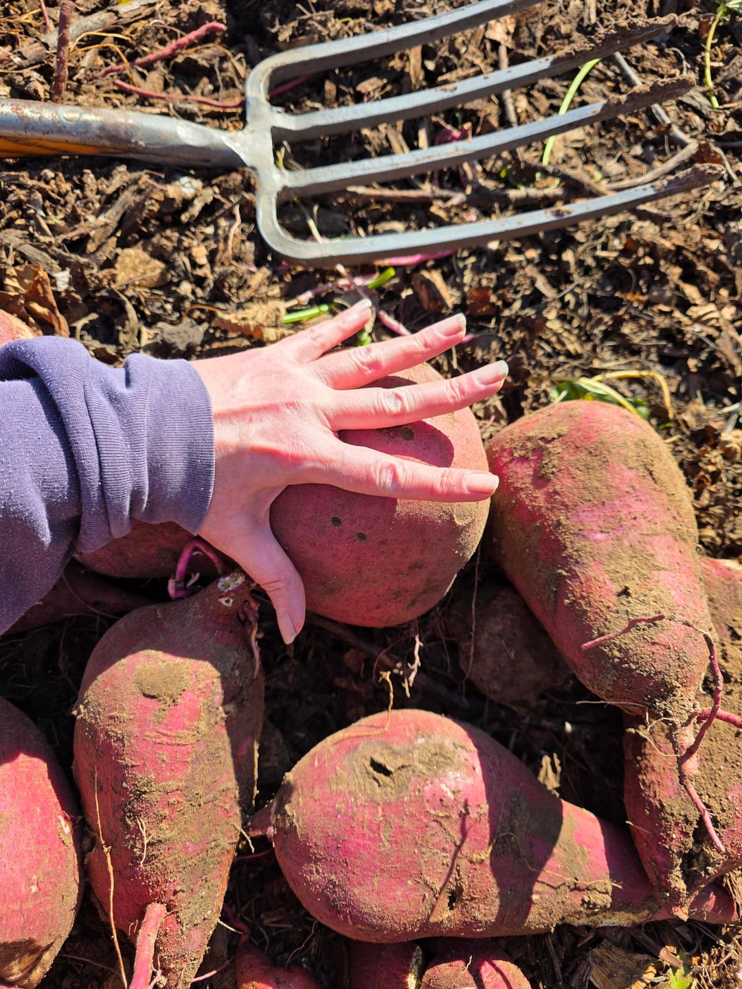 I didn't feel like dealing with slips, so I put down a whole sweet potato back in April because I think the vines are pretty and had a large bare spot to fill. This is what I harvested today, and I think they're New Jersey White? I really was only aiming to have attractive vines, and I figured I probably had some good tubers but not at this scale. And I put the sweet potato on top of the dirt and covered with wood chips. The mother sweet potato looks like the Borg Queen. lol