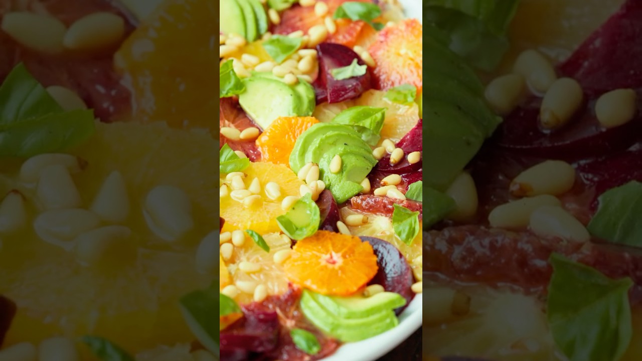 A gorgeous citrus salad with beets, avocado, toasted pine nuts, and a bright lemon vinaigrette.