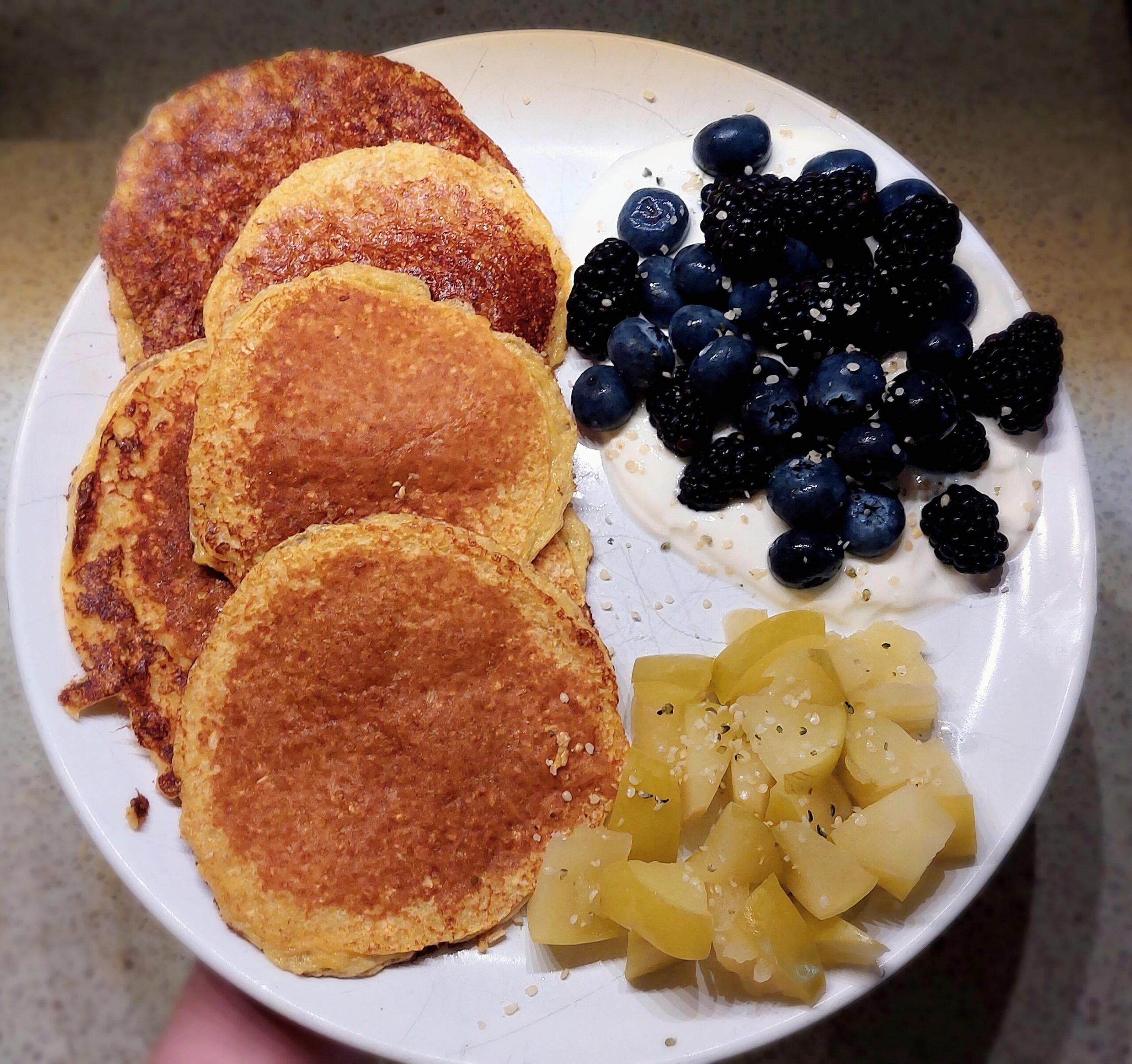 blitz until almost smooth. cook over medium heat like normal pancakes. they make 5 good sized pancakes. serve with fruit (today was greek yoghurt, blackberries, blueberries and stewed green apple with hemp seeds).