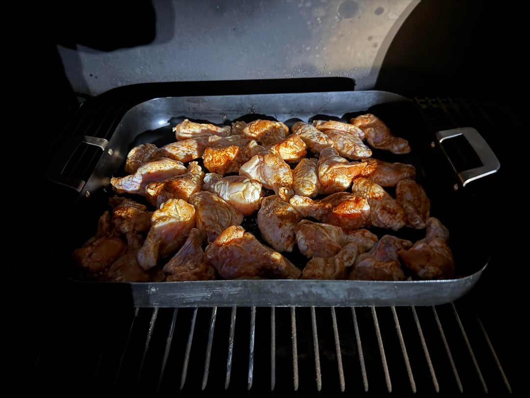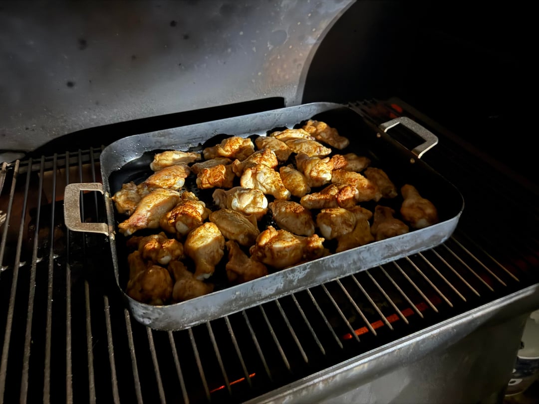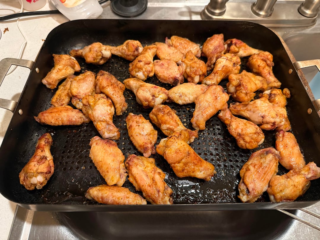 I am a not a great cook but I would leave the wings on the grates and spread them out more to allow air to circulate better.