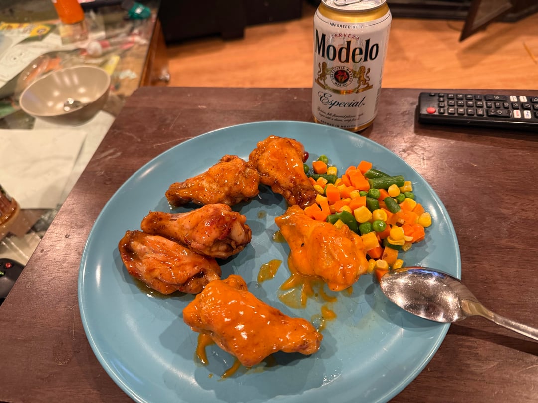 This was my first attempt at making 0 to 400 wings. I was pretty happy with the outcome. It could’ve been a little more crispy , and then we covered it with sweet chili sauce and buffalo sauce. It came out pretty damn good.