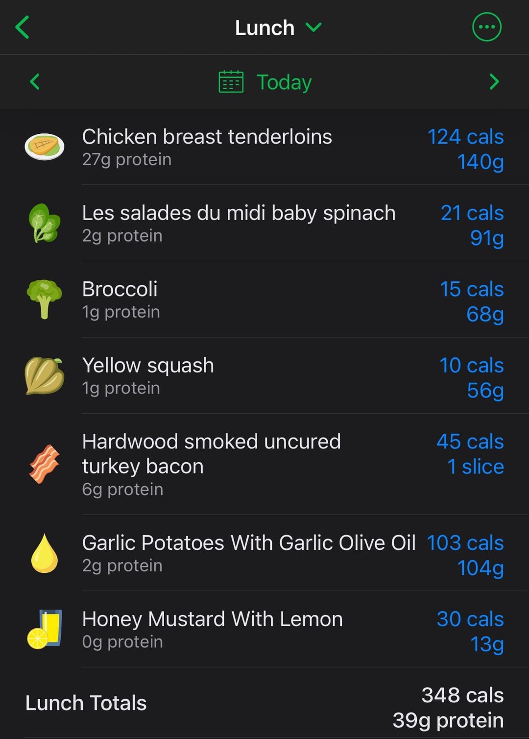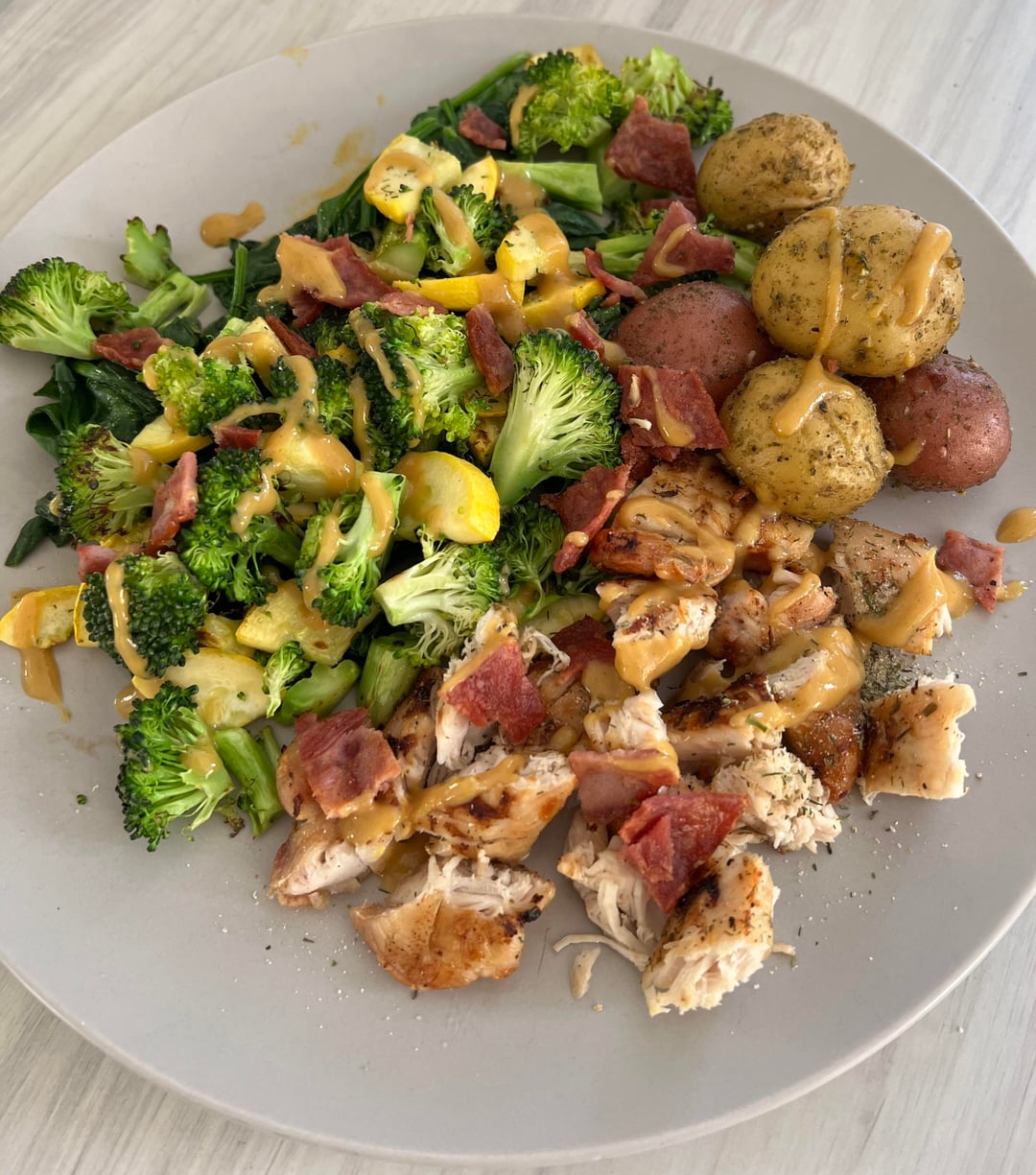 I made this delicious and filling plate today with only 348 calories and 39 grams of protein! 2 chicken breast tenders, baby potatoes, spinach, broccoli, yellow squash, one slice of turkey bacon chopped up for a topping, and a honey mustard drizzle I made myself (dijon, hot honey, and lemon). So good!