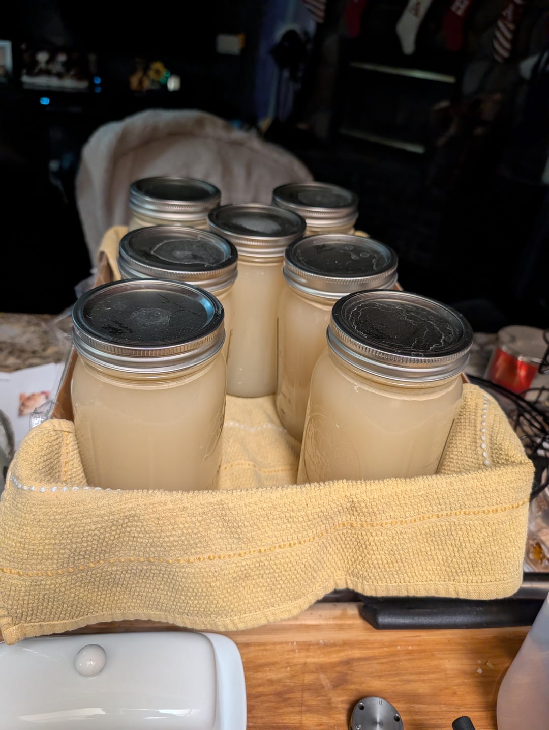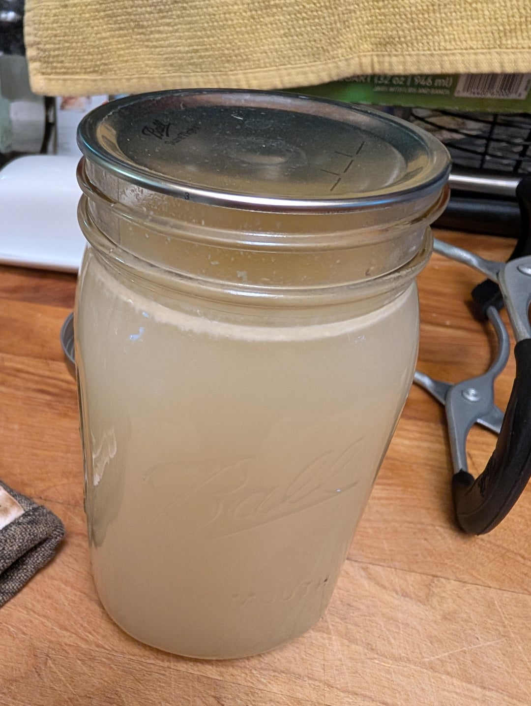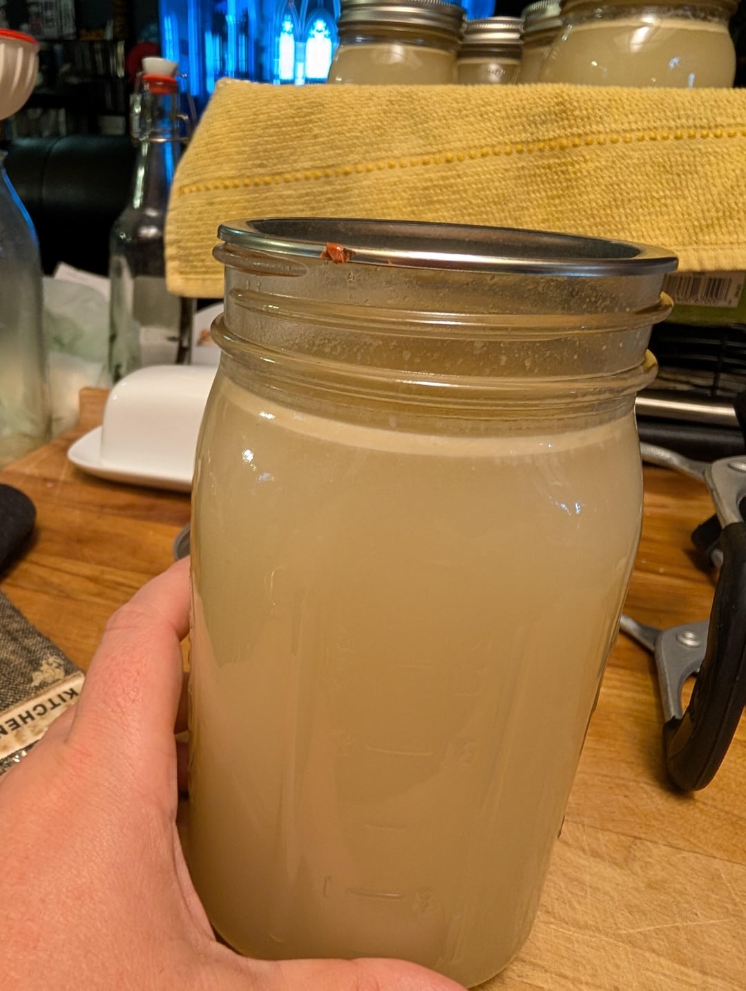 It looks like my last batch. The light stuff on top is probably fat – it’s hard to get all of it out. I attribute the cloudiness to minute bits of stuffing still stuck to the bones, and a long boiling time. The jar that didn’t seal tasted like turkey stock.