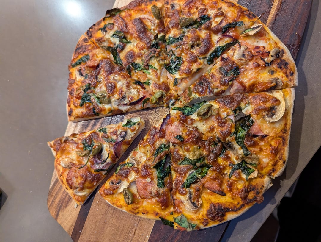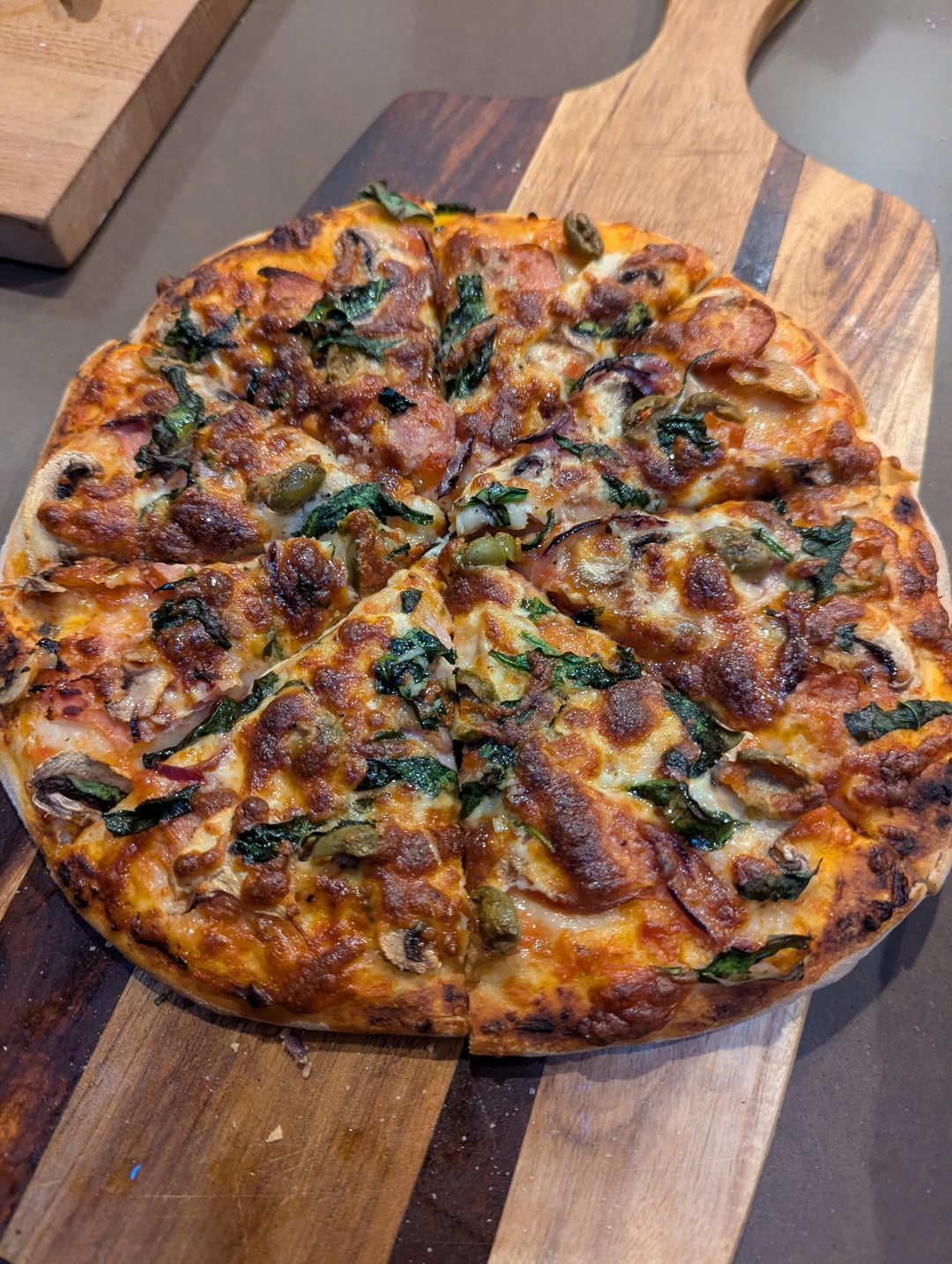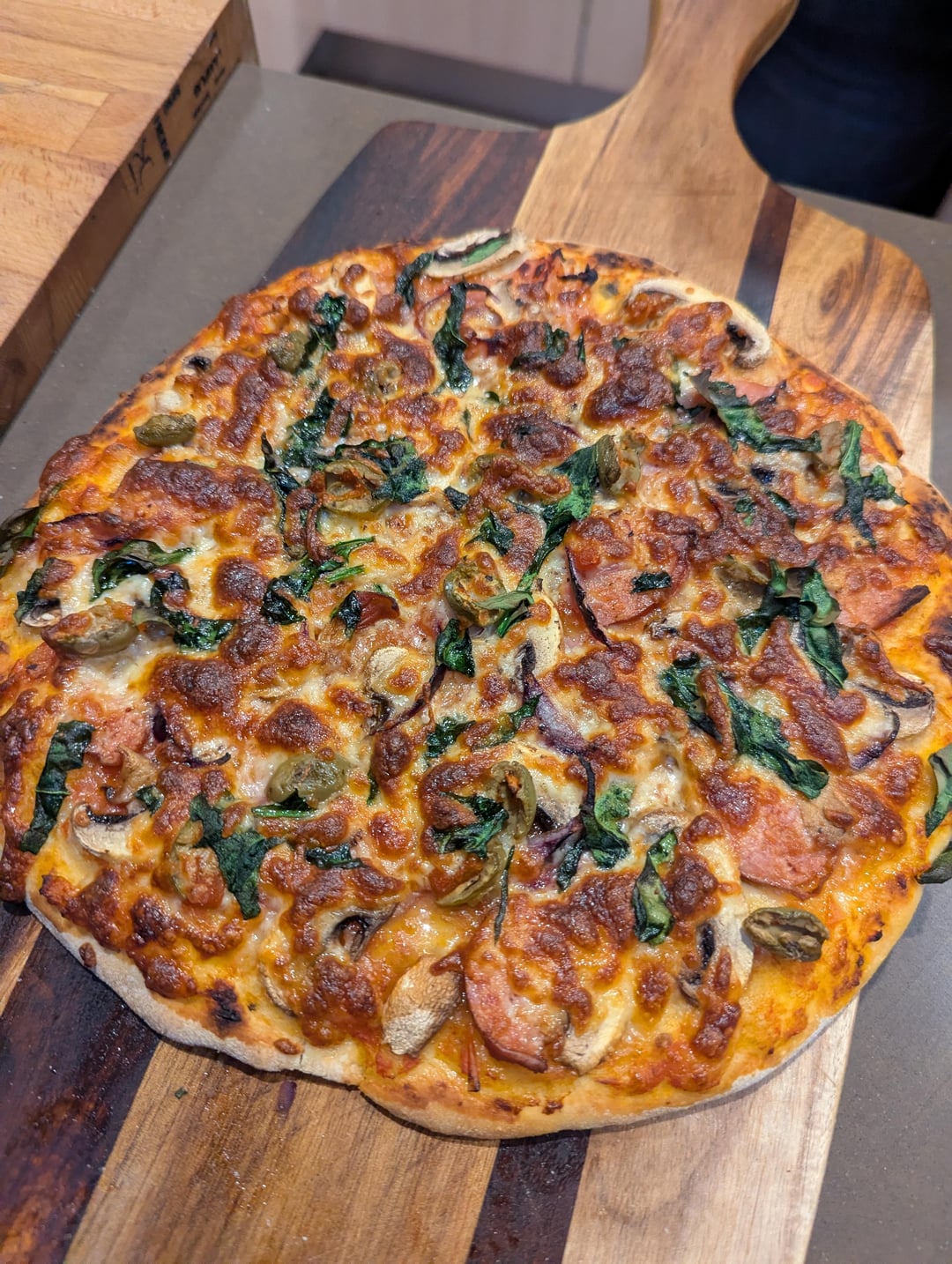 Contains typical yeast dough, tomato sauce, mozzarella, spinach, kabana, onion, olives, and mushroomsby Automatic-Ladder155 Dining and Cooking