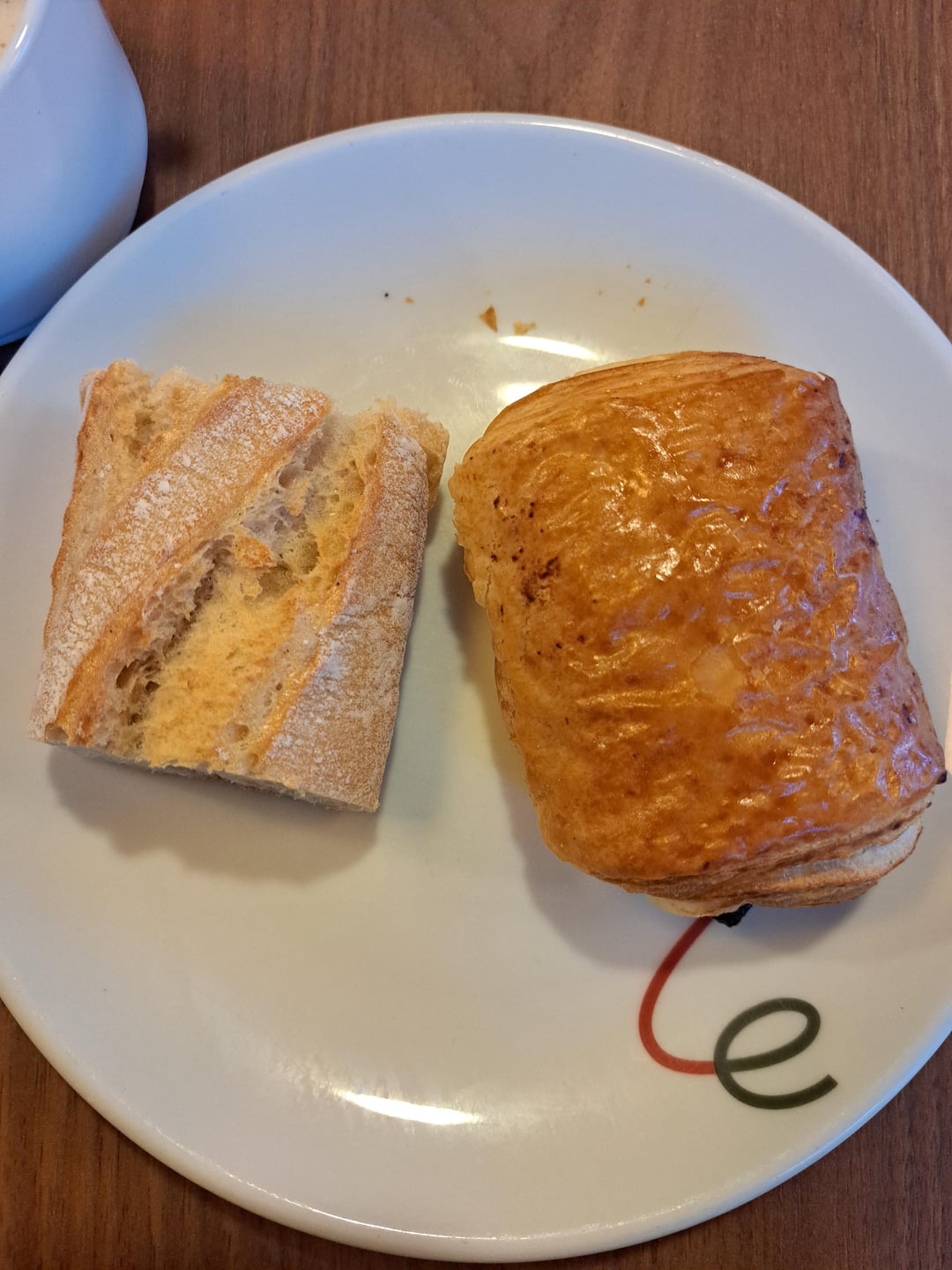 baguette 🥖 (180-220) and looks fairly large 100g pain au chocolat (370-410) with coffee and milk (100-150) depending on type of milk and amount of