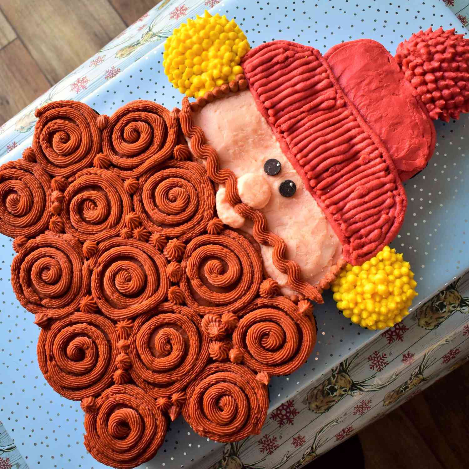 “Yukon Cornelius is my favorite, and an all-time classic, character from ‘Rudolph the Red-Nosed Reindeer,” Allstar Kim says. “Did you know that when he would throw his pick axe into the ice and taste the end of it, that he was actually looking for peppermint to mine? As such, I created this cupcake cake in his image with dark chocolate cupcakes filled with a peppermint-white chocolate ganache, and topped with peppermint buttercream. This is a fun and showstopping dessert — perfect for a “Rudolph” watch party!”