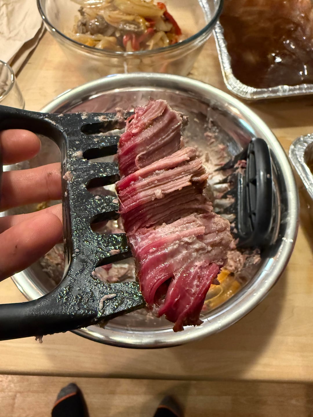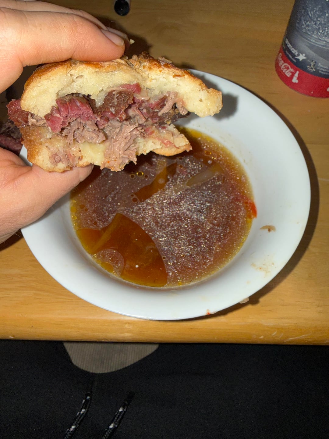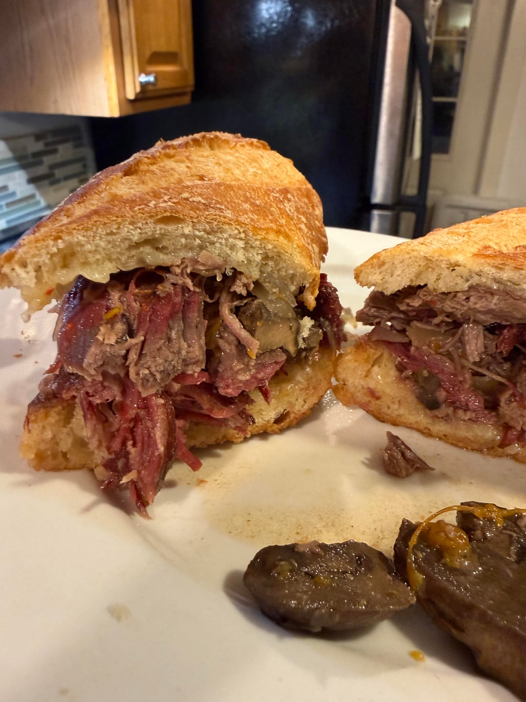Kinda reminds me more of an Italian beef than a French dip, but looks great. I made a boneless rib roast on my sister’s Traeger for thanksgiving and we made French dips out of the leftovers. Makes me really want a Traeger now