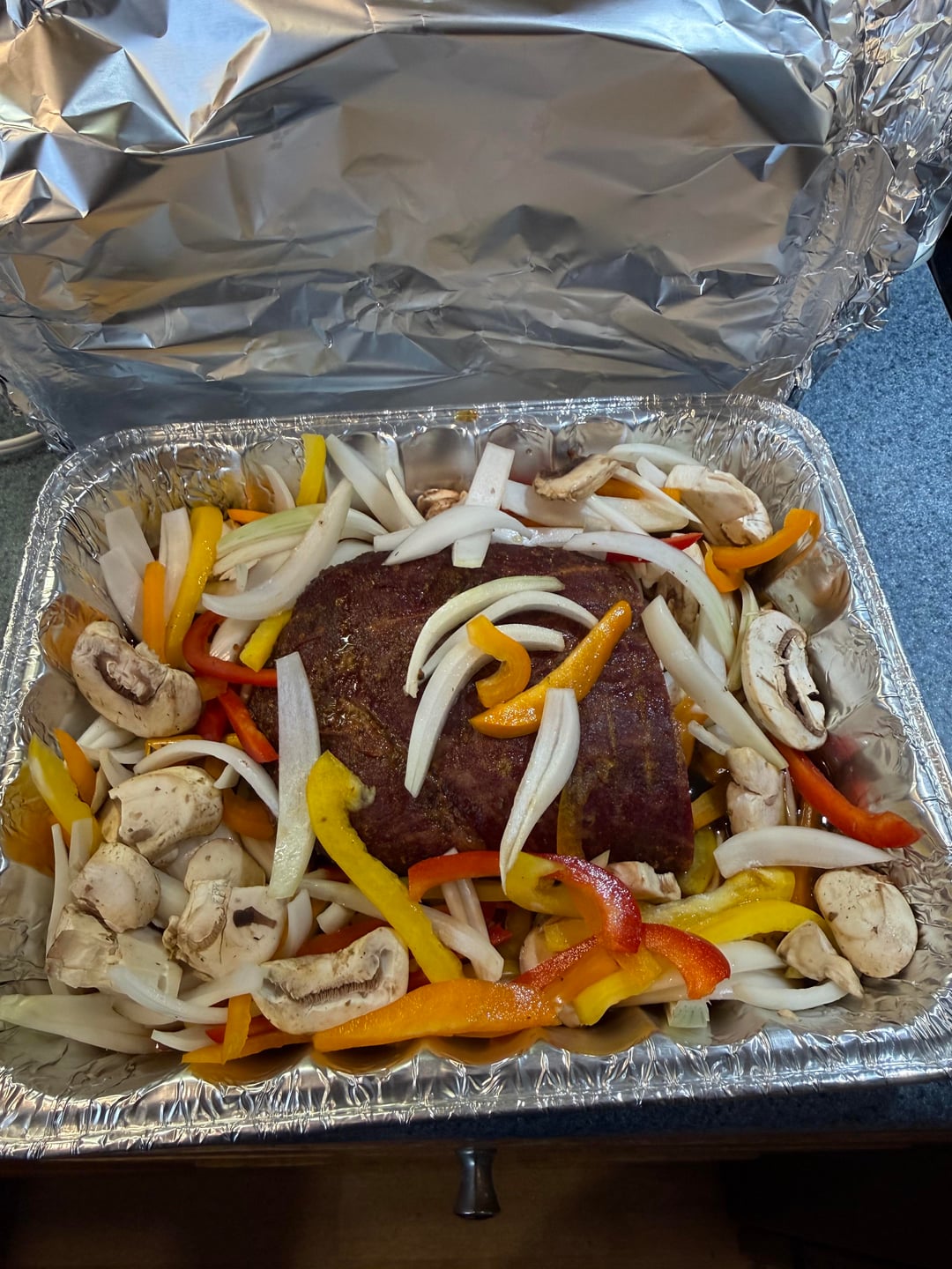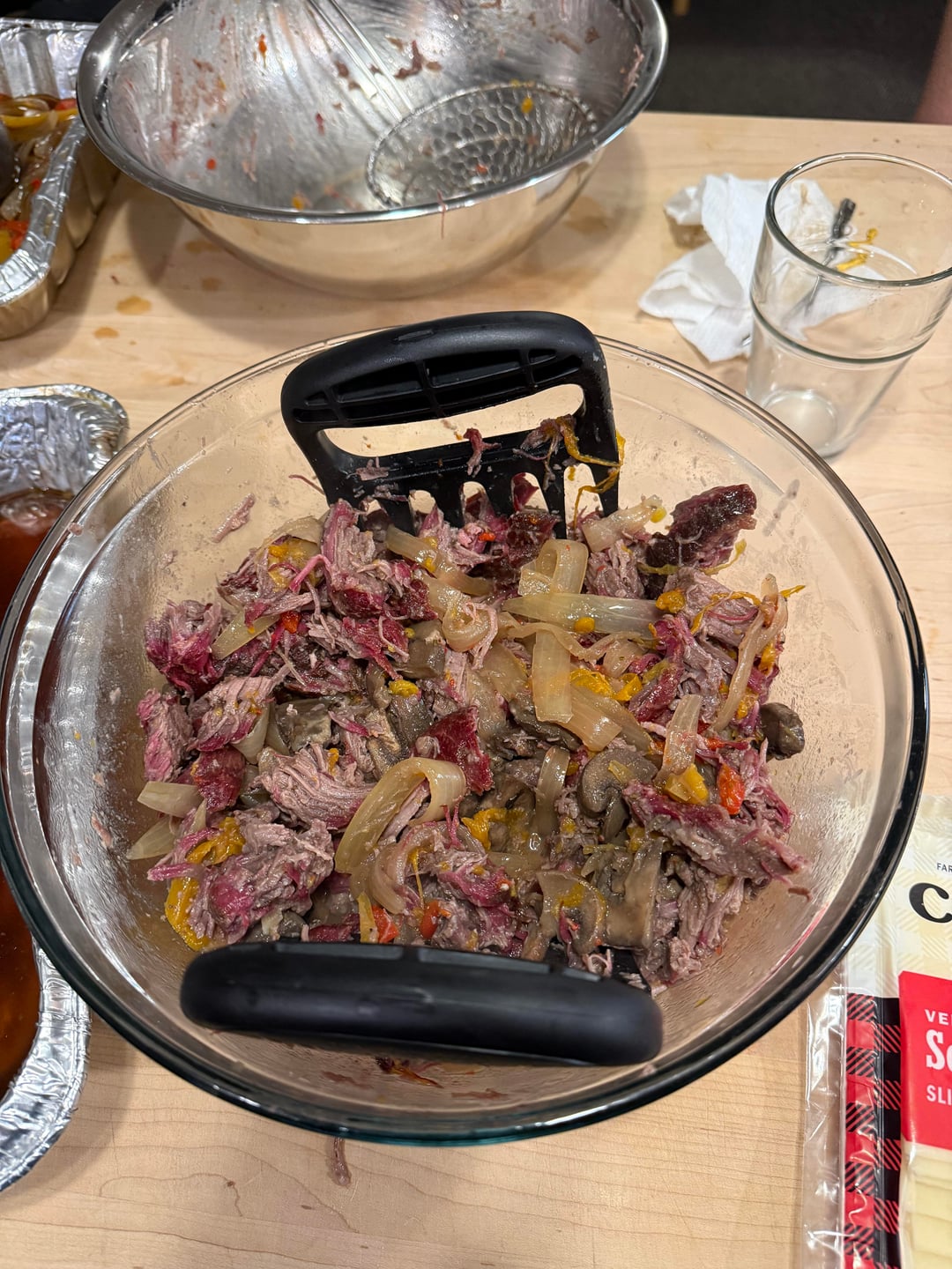 I started with a 4 pound beef chuck roast. I did a 12 hour dry brine (would’ve done 24 if I had the time for it) before I seasoned it up using mustard as a binder. I then smoked it for about 4 hours at 225, until it reached 165 internal. Once it reached 165, I took it off and put it in a tray with beef broth (pre boiled for time’s sake), sliced onions, peppers and mushrooms. Let this cook for another 4ish hours until the meat reached 205 internal and then it was time to shred. I separated the beef for shredding and added in the veggies after that was done. The leftover broth was the “dip” part of the sandwich.