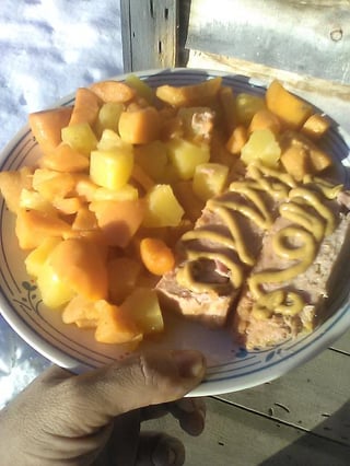 Todays ration: Hawaiian bake. 1 can ham, 2 can sweet potatoes, 1 can pineapple, some mustard. Cooked in a Dutch oven. Warm day outside. Took a picture of the camera i use since everyone asks about it.