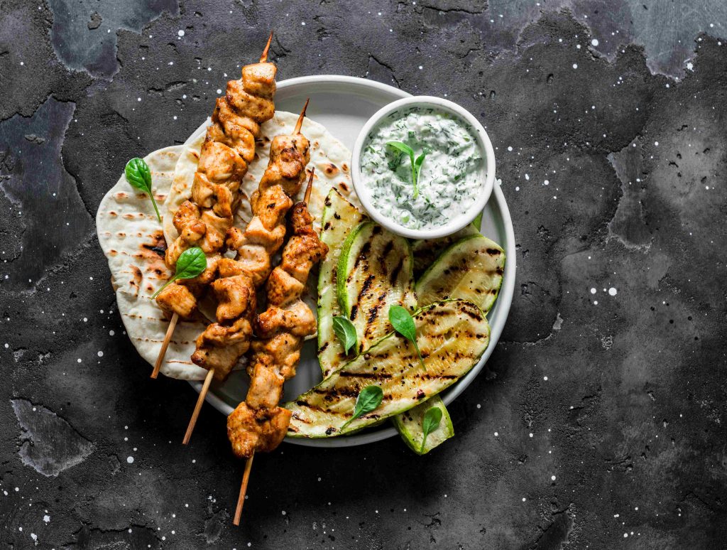 Chicken skewers souvlaki, grilled zucchini, pita bread and tzadziki sauce – delicious Greek style lunch on a dark background