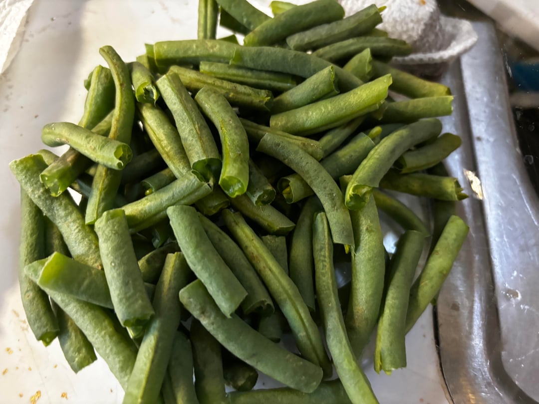 Fresh green beans with ends snapped and in about 1 1/2” pieces (nearly my entire bag went bad within three days of purchase so this could be amended by using a cheap bag of frozen green beans)