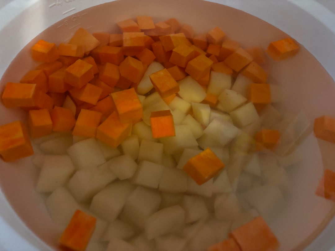 4-5 russet potatoes, peeled and diced into small cubes (put both of the potatoes in cold, salty water to keep from discoloring)